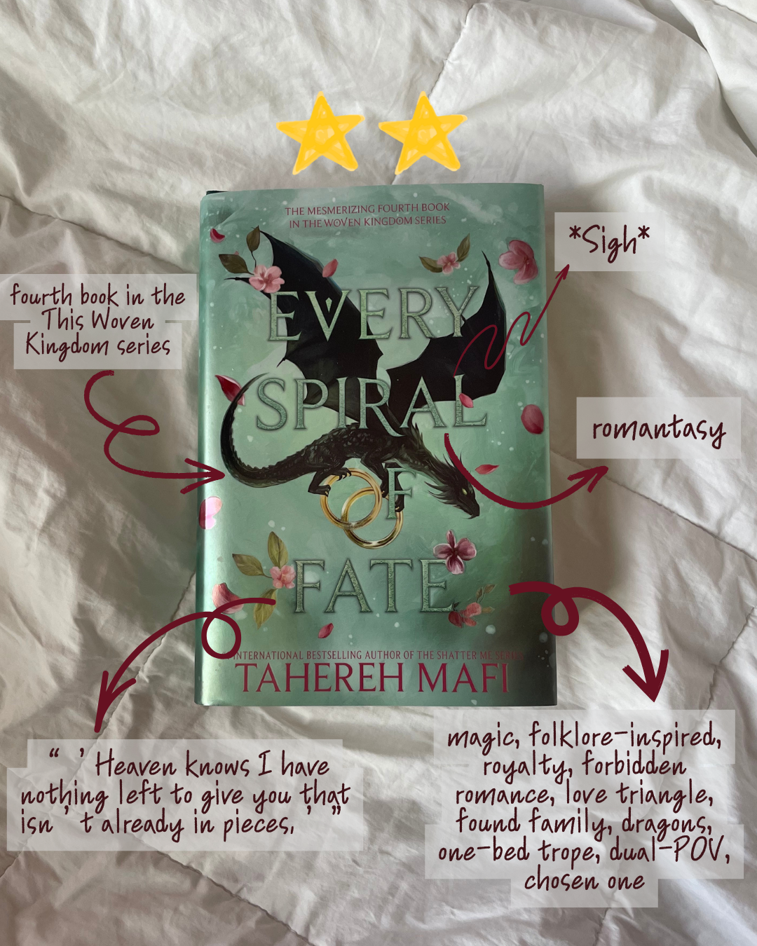 Starting 2026 off with dragons, magic, time travel, betrayal, and a giant Pacific octopus... Not going to lie, this was my reading goal last year, but I didn't make it. Like, I was waaaaay far off (22 books) because, well, I was busy, which is why I'm trying again this year — and am even more determined to reach it. The Dark Mirror is the fifth book in The Bone Season series, so let me rewind: The year is 2059, and Scion reigns with the intent of criminalizing voyants, aka people with "unnatural" abilities. Thus, voyants are forced to hide. In Scion London, Paige Mahoney is a rare dreamwalker and a high-ranking member of an underground, voyant-run criminal organization. But when Paige is captured by Scion's secret police, she is transported to Oxford, a hidden city ruled by the Rephaim, an ancient non-human race. Paige is essentially forced into servitude but finds herself under the tutelage of a mysterious Rephaite called Warden, who teaches her to fight and strengthen her abilities. But as Paige learns more about, well, everything, she realizes that it's not enough to just survive; she has to burn the entire system down. Since this is the second book in the series, let me set the stage from the first book, The Sword Catcher. Kel, aka cutie patootie #1, was taken from the orphanage to become Prince Conor's Sword Catcher, a body double meant to take a blade for him (and more) if needed. Though becoming the Sword Catcher gave Kel luxury and proximity to power, his main purpose is to live, bleed, and die for Conor, the heir to the throne. Cutie patootie #2 is Lin, a gifted Ashkar physician who lives within the walls of The Sault with other Ashkar, segregated due to their affinity for magic. But when a failed assassination attempt brings Lin and Kel together, she finds herself caught in court politics, conspiracies, and an infuriating attraction to a certain prince. Desperate for answers, Lin and Kel turn to the city's criminal mastermind, which pulls them straight into the city’s darkest secrets and sets the stage for The Ragpicker King. June Farrow comes from a line of women known to be cursed; no matter what, they always seem to go mad. After a year of hearing and seeing things that aren't there, June knows that the madness has begun coming for her. But after her grandmother passes away, she finds a string of cryptic clues surrounding her mother's disappearance and her family history, which leads her to cross through a red door that wasn't a hallucination after all. After she crosses the door's threshold, she finds herself still in her small town of Jasper, North Carolina — but in a time way before the one she came from. There, June learns more about the curse that has haunted generations of Farrow women and tries to uncover the truth behind her mother's mysterious actions and disappearance. Basically, to get y'all up to speed, Alizeh is the long-lost Jinn queen who, for years, has been forced to hide in plain sight as a servant among the Clay people after her parents were killed. Not only is she prophesied to be the end of King Zaal of Ardunia, but she's haunted by the devil, Iblees, who often shows up whenever misfortune enters her life. But when Alizeh and Prince Kamran cross paths, everything changes, and Alizeh is forced to come out of hiding, hoping to lead the Jinn people back to freedom. However, things get quite complicated once Cyrus, the young king of Tulan shows up, and Alizeh must confront the truth about her purpose, her identity, and Iblees, and decide what's best for her people. Seventy-year-old Tova is wading through grief after the recent death of her husband and the mysterious disappearance of their son, Erik, 30 years prior. She passes the time as a night cleaner at the local Sowell Bay Aquarium in Puget Sound, Washington. But when she discovers that Marcellus, the giant Pacific octopus, has been sneaking out of his tank to scavenge for food other than his usual fare, an unlikely friendship forms between them. Meanwhile, Cam is an irresponsible, can't-keep-a-job 30-year-old dealing with a breakup and mommy and daddy issues. His mom abandoned him when he was younger, and he never knew his dad. But when an old high school photo of his mom prompts Cam to go on a road trip in search of his father, he winds up in Puget Sound and learns things about himself and his past that he never expected. Here are the five books I read in January: • The Dark Mirror by Samantha Shannon (⭐️⭐️⭐️⭐️⭐️) • The Ragpicker King by Cassandra Clare (⭐️⭐️⭐️⭐️) • The Unmaking of June Farrow by Adrienne Young (⭐️⭐️⭐️⭐️) • Every Spiral of Fate by Tahereh Mafi (⭐️⭐️) • Remarkably Bright Creatures by Shelby Van Pelt (⭐️⭐️⭐️⭐️⭐️) What genre of book should I read in February?