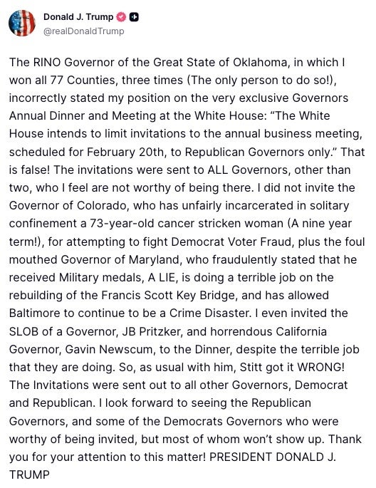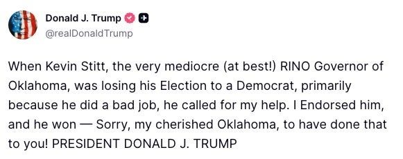 President Donald Trump on Wednesday finally delivered an apology ― but it was not the one many had called on him to make. Trump last week shared a racist video depicting former President Barack Obama and former first lady Michelle Obama as a chimpanzee and gorilla, which was denounced by Democrats and Republicans alike. But that’s not what he apologized for. Trump deleted the video, but insisted he didn’t have to apologize since he didn’t actually see the racist part. “No, I didn’t make a mistake,” he said last week. “I looked at the beginning of it. It was fine.” Trump, who rarely apologizes for anything, instead delivered a mea culpa to the people of Oklahoma for having previously endorsed their governor, Kevin Stitt, whom he denounced as “very mediocre (at best!)” and a “RINO” (Republican in name only). “Sorry, my cherished Oklahoma, to have done that to you!” he wrote on Truth Social: Trump threw a fit over Stitt’s efforts to preserve the bipartisan nature of the National Governors Association, of which he is currently the chair. Trump this week was reportedly planning to exclude Democratic governors from what had traditionally been a bipartisan NGA business meeting at the White House, and to exclude two governors from a dinner that is typically for every governor, regardless of party. Stitt initially pulled the event as a result. “Because NGA’s mission is to represent all 55 governors, the Association is no longer serving as the facilitator for that event, and it is no longer included in our official program,” Stitt wrote to his fellow governors, according to The Associated Press. Trump later claimed he was planning to invite all but two of the Democratic governors to the meeting, although The New York Times reported that only Republican governors had received invitations as of Tuesday night for a meeting to be held on Friday. In another post, the president attacked Stitt and several of the Democratic governors: Stitt has since said the meeting is back on and everyone will be invited. He blamed “misunderstanding in scheduling,” according to The Journal Record in Oklahoma City. By entering your email and clicking Sign Up, you're agreeing to let us send you customized marketing messages about us and our advertising partners. You are also agreeing to our Terms of Service and Privacy Policy.