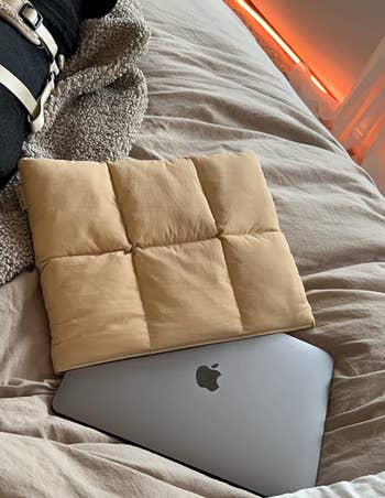 Promising review: "Going on a big trip soon and I bought this for travel. I am super obsessed with the quality and how light/soft it is. It's the perfect size for my laptop and acts as a cushion for other things in my backpack. It can be slightly tricky to open, I just slide one finger in and then expand my hand to open it but it has a magnetic-like closure. Love the color too, it's simple." —mandella cesena