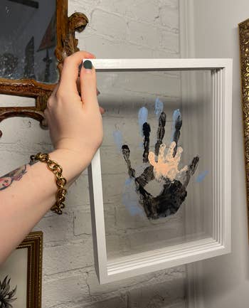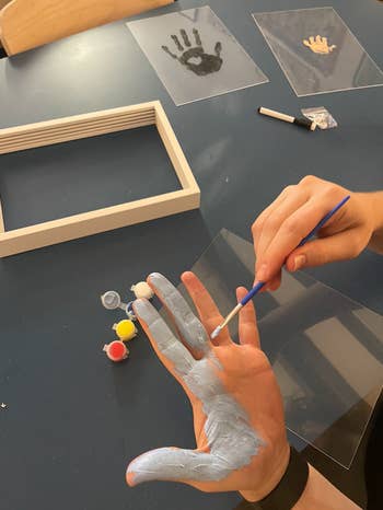 I impulse-bought this as an activity to do with my husband when my daughter was six months old. I'm not crafty, so heaven knows this kid isn't getting a scrapbook. Because of this lack of creativity, I've looked for different ways to mark memories with my baby. This kit provides step-by-step instructions, plenty of paint, and it's designed to easily wipe off so folks can try more than once. Although we did it in one go. Sure, it could have come out a little crisper if we'd tried it twice, but life's messy. And I love our little family's smudges.