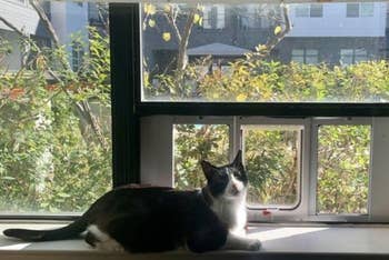 Promising review: "I love this! We didn’t have a good place to make a hole in the wall to our backyard but we do have low windows next to our fireplace, so it was a match to get this window door. It was super easy to install and we love the locking feature. We got a snow storm and it took a while for our garden beds to stop being muddy. We locked the door so kitty wouldn’t bring in mud. I will say it is a bit drafty, so we got an extra weather strip to secure the draftiness. Our kitty only took a couple of days to get used to it too. We put his food just outside the window and he had to get used to going out there to get his food. All in all it was a great buy!" —AlyHowell