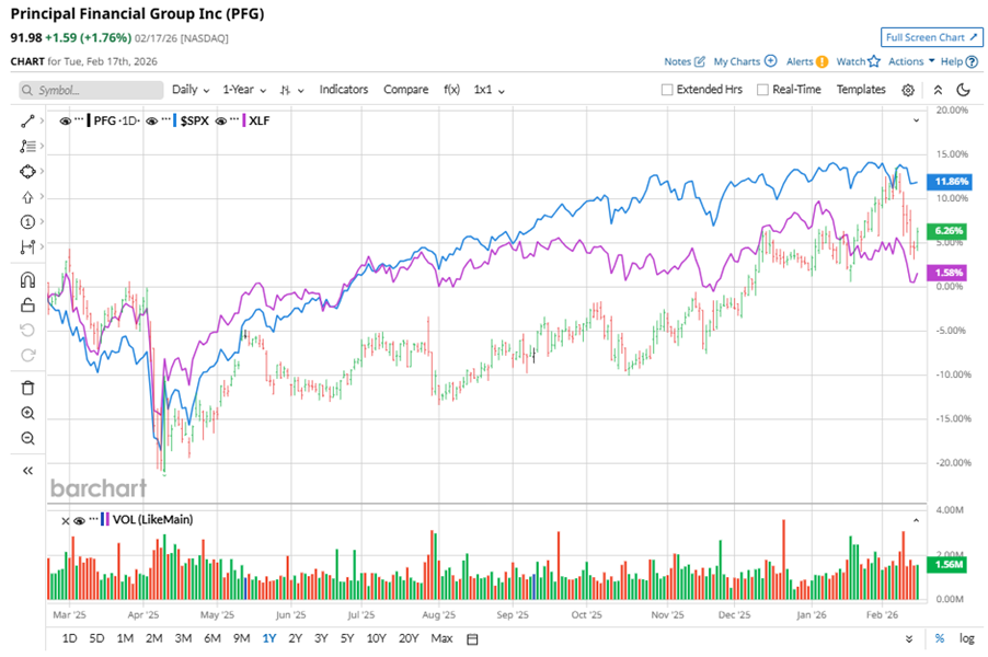 Des Moines, Iowa-based Principal Financial Group, Inc. (PFG), is a leading global financial services provider that offers a wide range of financial products and services to individuals, corporations, and institutional clients. With a market cap of $20.1 billion, the company offers retirement solutions, life and health insurance, wellness programs, and investment and banking products. Shares of this global financial services company have underperformed the broader market over the past year. PFG has gained 7.4% over this time frame, while the broader S&P 500 Index ($SPX) has rallied nearly 11.9%. However, in 2026, PFG stock is up 4.3%, surpassing the SPX’s marginal fall on a YTD basis. Cathie Wood Adds 210K Shares to a Rising AI Bet With Upside of 102% Is GOOG Stock a Buy Amid the Software Selloff? Broadcom Is ‘Sitting on a Sinking Iceberg.’ Why 1 Analyst Is Warning on AVGO Stock Here. Tired of missing midday reversals? The FREE Barchart Brief newsletter keeps you in the know. Sign up now! Narrowing the focus, PFG’s outperformance is apparent compared to the Financial Select Sector SPDR Fund (XLF). The exchange-traded fund has gained marginally over the past year. Moreover, the stock’s returns on a YTD basis outshines the ETF’s 4.7% losses over the same time frame. On Feb. 9, PFG shares closed down by 1.5% after reporting its Q4 results. Its adjusted EPS of $2.19 did not meet Wall Street expectations of $2.23. The company’s full year adjusted EPS growth is expected to be 9% to 12%. For the current fiscal year, ending in December, analysts expect PFG’s EPS to grow 13.4% to $9.38 on a diluted basis. The company’s earnings surprise history is disappointing. It missed the consensus estimate in three of the last four quarters while beating the forecast on another occasion. Among the 14 analysts covering PFG stock, the consensus is a “Hold.” That’s based on three “Strong Buy” ratings, nine “Holds,” and two “Strong Sells.” This configuration is less bullish than two months ago, with four analysts suggesting a “Strong Buy.” On Feb. 10, Piper Sandler Companies (PIPR) analyst John Barnidge maintained a “Buy” rating on PFG and set a price target of $100, implying a potential upside of 8.7% from current levels. The mean price target of $93.17 represents a 1.3% premium to PFG’s current price levels. The Street-high price target of $106 suggests an upside potential of 15.2%. On the date of publication, Neha Panjwani did not have (either directly or indirectly) positions in any of the securities mentioned in this article. All information and data in this article is solely for informational purposes. This article was originally published on Barchart.com