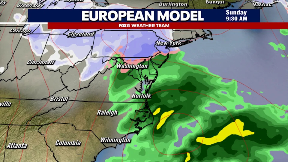 The Brief Weather models continue to debate the strength and position of a weekend storm system. The most likely scenario involves rain on Sunday morning changing to mix and then wet snow by Sunday night. The threat for accumulation has come up over the last 24 hours, with most models suggesting anywhere from 1-5" of snowfall in the D.C. region. Some extreme solutions suggest 6" or more could be possible. The threat WASHINGTON - Compared to the previous several weeks in the D.C. region, this past week has not been so bad. Sure, it has been rather cloudy and chilly, but temperatures have been consistently above freezing, allowing the region to slowly but steadily free itself from the so-called "snowcrete" that has blanketed the D.C. area for the better part of a month now. Temperatures are expected to remain above freezing into the upcoming weekend, with the best day of the entire week potentially being Saturday, with partial sunshine and middle 50s expected in the afternoon. By Saturday night, the pattern does start to shift though, as a strong dip in the jetstream sends temperatures falling back into the 30s overnight Saturday into Sunday. At the same time, a storm system is forecast to develop ahead of this cold push, which could bring a wide range of precipitation to the D.C. region, including the threat for accumulating snowfall. The big snow debate The big question of course, is how much snow? It’s a question that remains relatively difficult to answer even with just a couple days to go ahead of the potential storm system. The key to any potential storm system is its track, and its intensity. These are two features that weather models have continued to struggle with. Our general thoughts in the weather department this evening lead a little closer to the European model. With temperatures well above freezing at onset, the system would likely start as a predominantly rainfall event through the front part of the day on Sunday. Then, as a surface storm pushes eastward into the Atlantic, colder air fills in as the storm pulls away, along a weather feature known as an inverted surface trough. This would bring the risk for rain to change over to mix and a perhaps a period of potentially heavy, wet snowfall on Sunday night. Now, the tricky part of the forecast with an inverted trough situation is the area that gets accumulating snowfall tends to be in a relatively narrow band that follows the trough axis, so not everyone in the region would be looking as a decent snowfall, it would be localized in this banding. Forecasting exactly where it would setup is very difficult, and we would not have a good idea of where this feature sets up until likely closer to Saturday evening. If this solution, which the European Model has been hinting at for the last couple of days, is the correct solution, then parts of our region could see a 1-3" with an upside risk of 3-6" snowfall potential by the time the storm exits late Sunday night into early Monday morning. On the other hand, you have the American model solution, which for the better part of a day now has suggested the storm could be much more impactful. With a stronger tilt in the jetstream, the weather model suggest that a more intense storm system will develop that stays much closer to the coastline. While it also starts as rainfall on Sunday morning, the intensifying surface low pulls cold air quickly into the storm, dropping temperatures in the DC region and changing rainfall over to a widespread heavy snowfall. The model is aggressive with a heavy, impactful snowfall for everyone, with final snow totals in the double digits. Now, most forecasters agree this evening that this solution is rather extreme and unlikely to be the case with this storm. While we cannot rule it out of the realm of possibility, it is generally on its own, with most other guidance as of Thursday night suggesting lesser snowfall totals are more likely. So, if we do not believe the American model solution, what is the debate this evening? The issue lies in model consistency. Weather models have admittedly been extremely poor with the forecast solutions for the Sunday storm system. Even the European, which does have a history of being more accurate than the American model, has been extremely "jumpy" with this storm system. Sometimes jumping the system east, showing less snowfall, then bringing the storm back west, showing more snowfall. Forecasters look for run-to-run consistency, and so far we really have not seen that from any weather model just yet. The reason why has everything to do with the pattern. It is not just one piece of atmospheric energy helping steer this storm system, but multiple. The more pieces you have involved with a developing storm system, the more prone you are to errors in the forecast. This is why we might not have a truly good hold on what this system could do in the DC region until closer to Friday night or even Saturday, when the energy pieces involved in the formation of this storm system are all well sampled and better analyzed. What to be prepared for This one is going to come down to the wire in terms of figuring out snowfall amounts. What I can guarantee is this will not be a repeat of the late January storm. Temperatures will not be as cold, even after the system — no "snowcrete" this time around. This would also be wet snow, and we would likely lose some to ground melt in areas no longer covered in snow from the January system, as temperatures have been above freezing much of this week. A key thing we want to mention: A lot of people are saying, "but it is too warm to snow on Sunday! The Weather App says it will be in the 40s!" While yes, this is too warm to snow at onset...remember that your weather app is giving you the high temperature for the day. Through a process known as dynamic cooling, temperatures can cool as you bring in cooler air on the back side of a storm system, due to the upper-level trough swinging through. So, temperat