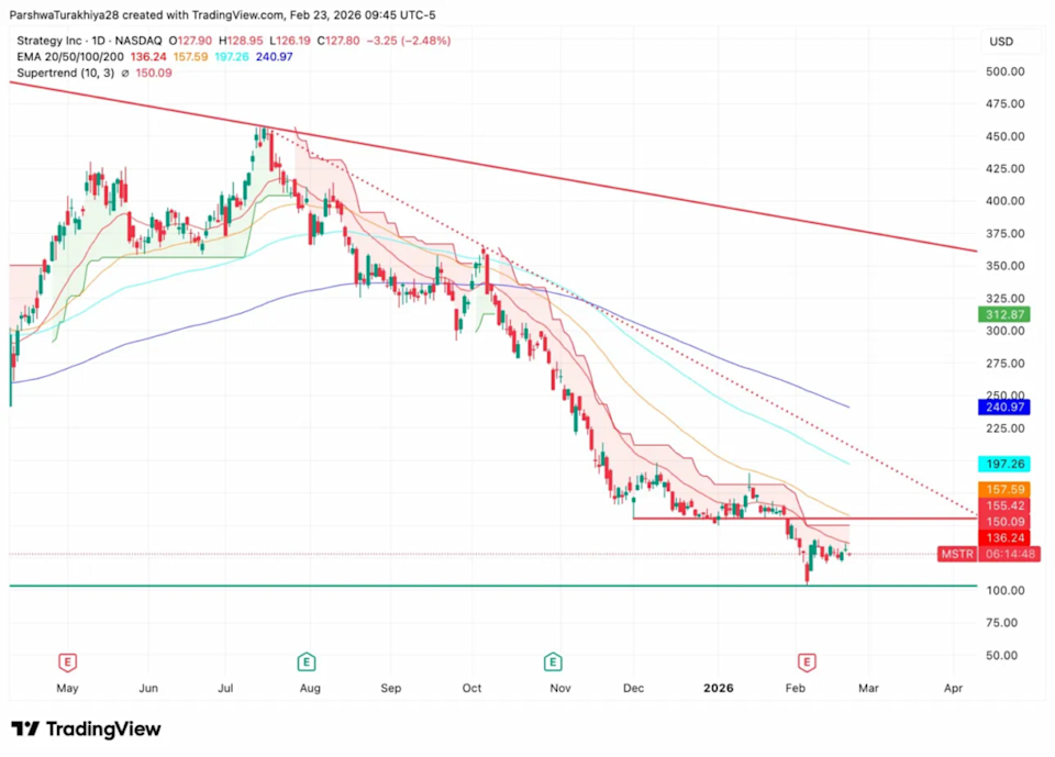 Benzinga and Yahoo Finance LLC may earn commission or revenue on some items through the links below. Strategy (NASDAQ:MSTR) bought 592 Bitcoin (CRYPTO: BTC) for $39.8 million marking its 100th purchase announcement since August 2020, despite sitting on a $7 billion unrealized loss. Strategy sold 297,940 shares of common stock between February 17-22, generating $39.7 million in net proceeds. The company used the entire amount to buy 592 BTC at an average price of $67,286 per coin. Total holdings now stand at 717,722 BTC acquired for $54.56 billion at an average price of $76,020 per coin. Don't Miss: The AI Marketing Platform Backed by Insiders from Google, Meta, and Amazon — Invest at $0.85/Share Explore the Fire-Safe Energy Storage Company With $185M in Contracted Revenue With Bitcoin trading just above $66,000, Strategy sits on an unrealized loss of roughly $10,000 per coin—approximately $7 billion total. Executive Chairman Michael Saylor posted a cheeky announcement on X, celebrating the 100th Bitcoin purchase disclosure since the company began accumulating in August 2020. The milestone underscores Saylor’s unwavering commitment to the strategy despite mounting paper losses. Strategy retains significant capital-raising capacity with $7.84 billion available under its common stock ATM facility and billions more across multiple perpetual preferred stock series. This suggests the buying will continue regardless of Bitcoin’s price trajectory. Trending: Before the IPO: How One Company Quietly Locked Up 500+ Iconic Character Rights MSTR is down 3%, trading 47% below the 200 EMA at $240.97—an extraordinary gap illustrating the collapse’s severity. All EMAs stack far overhead: 20 EMA at $136.24, 50 EMA at $157.59, 100 EMA at $197.26, and 200 EMA at $240.97. The Supertrend at $150.09 remains firmly bearish. A descending trendline from the $473 peak defines the downtrend, with MSTR accelerating below even this bearish channel in recent capitulation. See Also: 1.5 Million Users Are Already Working Inside This AI Platform — Investors Can Still Get In Critical support at $155-$165 was annihilated after holding multiple times in December-January. That former support now acts as formidable resistance. The only remaining technical floor sits at $105-$110, shown in green at the bottom. MSTR briefly touched this level during capitulation before bouncing to current levels. Current price sits only 20% above $105-$110 support. Today’s 3% decline shows selling pressure hasn’t relented. The stock is stuck in a death zone between $120-$140, unable to generate meaningful bounces but holding above ultimate support. Breaking below $120 on a daily close will likely accelerate toward retesting $105-$110. If that critical support fails, the stock enters true price discovery with next support potentially at $90, then $75, or lower. Image: Shutterstock Read Next: Invest Like Hollywood's Elite: Own a Stake in Valley Wellness' Luxury Behavioral Health Retreat Building a resilient portfolio means thinking beyond a single asset or market trend. Economic cycles shift, sectors rise and fall, and no one investment performs well in every environment. That's why many investors look to diversify with platforms that provide access to real estate, fixed-income opportunities, professional financial guidance, precious metals, and even self-directed retirement accounts. By spreading exposure across multiple asset classes, it becomes easier to manage risk, capture steady returns, and create long-term wealth that isn't tied to the fortunes of just one company or industry. Rad AI's award-winning artificial intelligence technology helps transform data chaos into actionable insights, enabling the creation of high-performing content with measurable ROI. Their Regulation A+ offering allows investors to participate at $0.85 per share with a minimum investment of $1,000, providing an opportunity to diversify portfolios into early-stage AI innovation. For investors seeking exposure to the rapidly growing AI and tech sector, Rad AI offers a chance to get in on the ground floor of a data-driven growth story. Paladin Power is addressing the growing demand for energy independence with a fire-safe energy storage system that doesn't rely on lithium-ion batteries. Instead, its ESS uses non-lithium, solid-state graphene battery technology designed for durability, safety, and long service life—positioning it as an alternative to fire-prone storage solutions that dominate today's market. Since launching in 2023, Paladin has generated $185 million in contracted revenue, achieved strong year-over-year growth, and secured a manufacturing agreement with NYSE-listed Jabil. With systems already deployed across residential and commercial properties and a $500B global electrification market opportunity ahead, Paladin offers investors exposure to decentralized energy infrastructure backed by real contracts, U.S.-based manufacturing, and scalable next-generation technology. Elf Labs is an IP-focused entertainment company built on a strategy that has powered giants like Disney and Marvel: ownership of globally recognized character IP. After more than a decade of rights acquisition, the company controls 500+ protected trademarks and copyrights tied to iconic characters including Cinderella, Snow White, Rapunzel, Sleeping Beauty, and Peter Pan. This foundation has generated over $15 million in royalties, expanded licensing into 30+ countries, and supported development of 100+ product lines. With its Nasdaq ticker ($ELFS) reserved and valuation growth exceeding 1,600% in under two years, Elf Labs is now scaling distribution through patented production systems, global licensing, and streaming and mobile initiatives—offering investors exposure to a private entertainment company with a clear public-market trajectory. Valley Center Wellness is setting a new benchmark in luxury behavioral health with its flagship facility in Corona, California. Desi