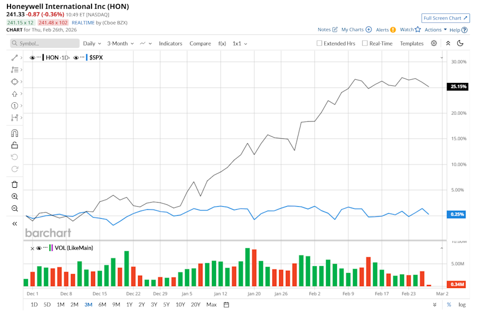 Charlotte, North Carolina-based Honeywell International Inc. (HON) is an industrial technology leader that provides building automation, industrial automation, and process automation & technology services. It is valued at a market cap of $154 billion. Companies valued at $10 billion or more are typically classified as “large-cap stocks,” and HON fits the label perfectly, with its market cap exceeding this threshold, underscoring its size, influence, and dominance within the conglomerates industry. Known for its strong engineering capabilities and recurring revenue from long-term service contracts, HON is well positioned as a leader in automation, digitalization, and energy efficiency solutions. 3 Highest Rated Dividend Kings for Generations of Income As Nvidia Launches New AI Laptop Chips, Should You Buy NVDA Stock? GE Aerospace Is Linking Up with Palantir. Should You Buy GE Stock Here? Get exclusive insights with the FREE Barchart Brief newsletter. Subscribe now for quick, incisive midday market analysis you won't find anywhere else. This industrial giant is currently trading 2.4% below its 52-week high of $246, reached on Feb. 23. Shares of HON have rallied 27% over the past three months, considerably outperforming the S&P 500 Index’s ($SPX) 1.6% rise during the same time frame. Moreover, on a YTD basis, shares of HON are up 23.7%, compared to SPX’s 1.1% gain. In the longer term, HON has surged 21% over the past 52 weeks, outpacing SPX’s 16.2% uptick over the same time frame. To confirm its bullish trend, HON has been trading above its 200-day moving average since early January and has remained above its 50-day moving average since mid-December, with slight fluctuations. On Jan. 29, shares of HON surged 4.9% after delivering mixed Q4 results. The company's overall revenue increased 6.4% year-over-year to $9.8 billion, but missed analyst estimates by 1.5%. However, HON’s strong organic revenue growth of 11% might have impressed investors. Moreover, its adjusted EPS of $2.59 grew 17% from the same period last year and came in 2.1% ahead of Wall Street estimates, further bolstering confidence. HON has outpaced its rival, 3M Company (MMM), which gained 11.9% over the past 52 weeks and 3.1% on a YTD basis. Given HON’s recent outperformance, analysts remain moderately optimistic about its prospects. The stock has a consensus rating of "Moderate Buy” from the 23 analysts covering it, and the mean price target of $249.27 suggests a 3% premium to its current price levels. On the date of publication, Neharika Jain did not have (either directly or indirectly) positions in any of the securities mentioned in this article. All information and data in this article is solely for informational purposes. This article was originally published on Barchart.com