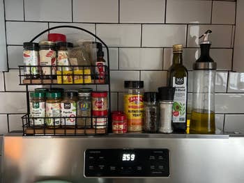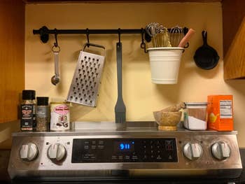 Promising review: "This product is so simple but already feels like it has a huge impact on my kitchen. I have a tiny kitchen, so I need to sneak any extra storage where I can, and this adds a shelf that wasn’t there before. I am looking forward to adding the Stoveshelf oil bottle set to my collection, so my most frequently used cooking oils are that much easier to grab." —Alison W
