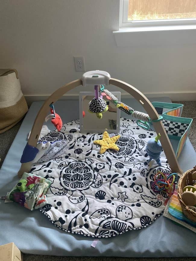Promising review: "Originally I was looking for a playmat similar to the lovevery playmat, and I was gonna buy it used until I saw this playmat for a fraction of the price. My baby’s nursery is ocean themed so it definitely helped me sway towards this option. I’m so glad I picked this instead! My baby loves this thing and we use it everyday. It’s super engaging and I love how it has a black and white side for newborns and the colorful side for an older baby! It’s super easy to set up! You can also fold it up and put it aside so perfect for travel and small spaces! 10/10 recommend!" —Victoria Lilley