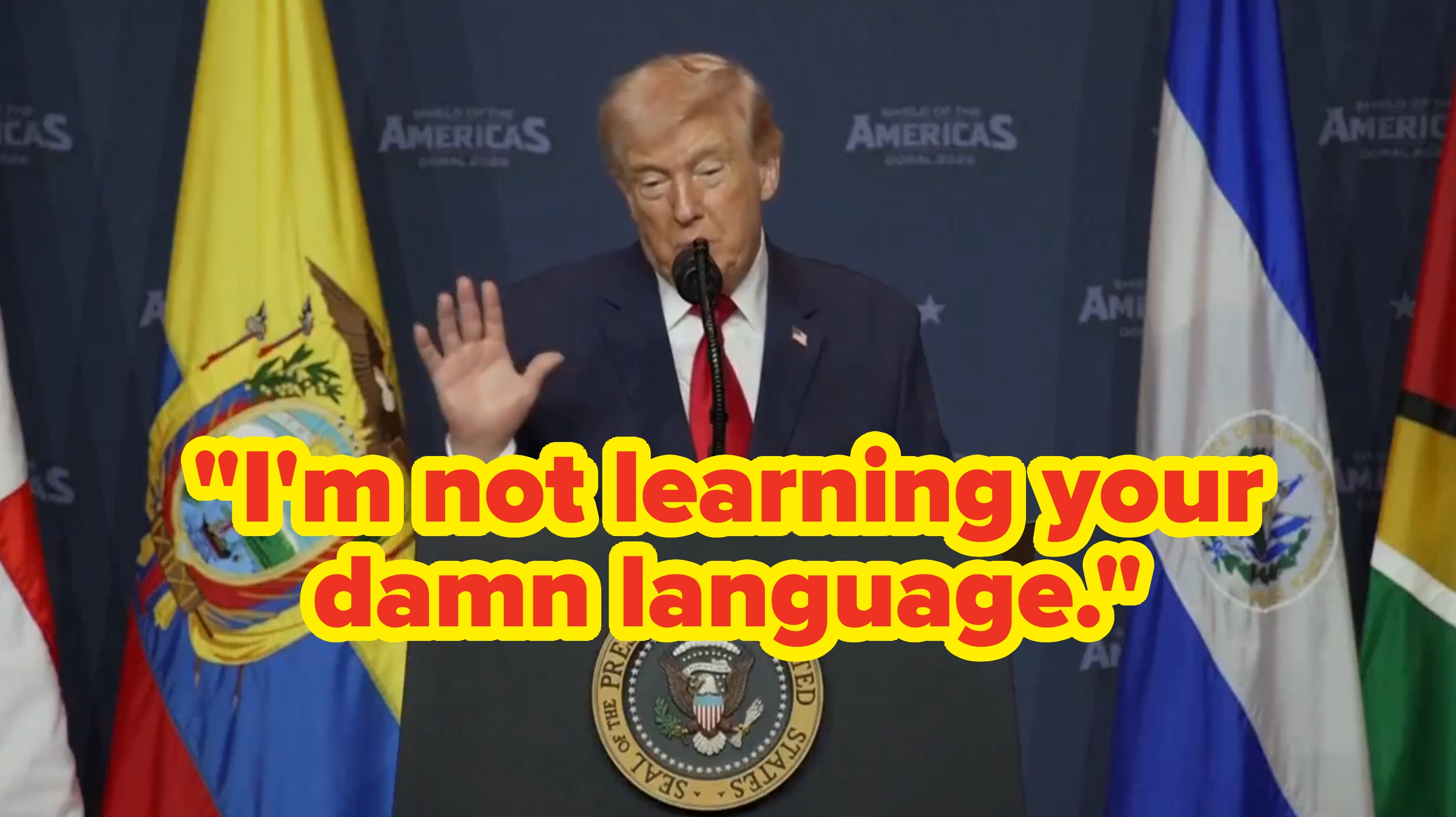 "He really ought to be busy studying English vocabulary, grammar, and punctuation." Hi, Iβm Michaela Bramwell, and I'm a Junior Staff Writer here at BuzzFeed, covering everything trending news, from your latest viral TikTok to the chaos of today's politics. Trump to Latin American leaders: "I'm not learning your damn language. I don't have time." pic.twitter.com/02eQBPS9Gv