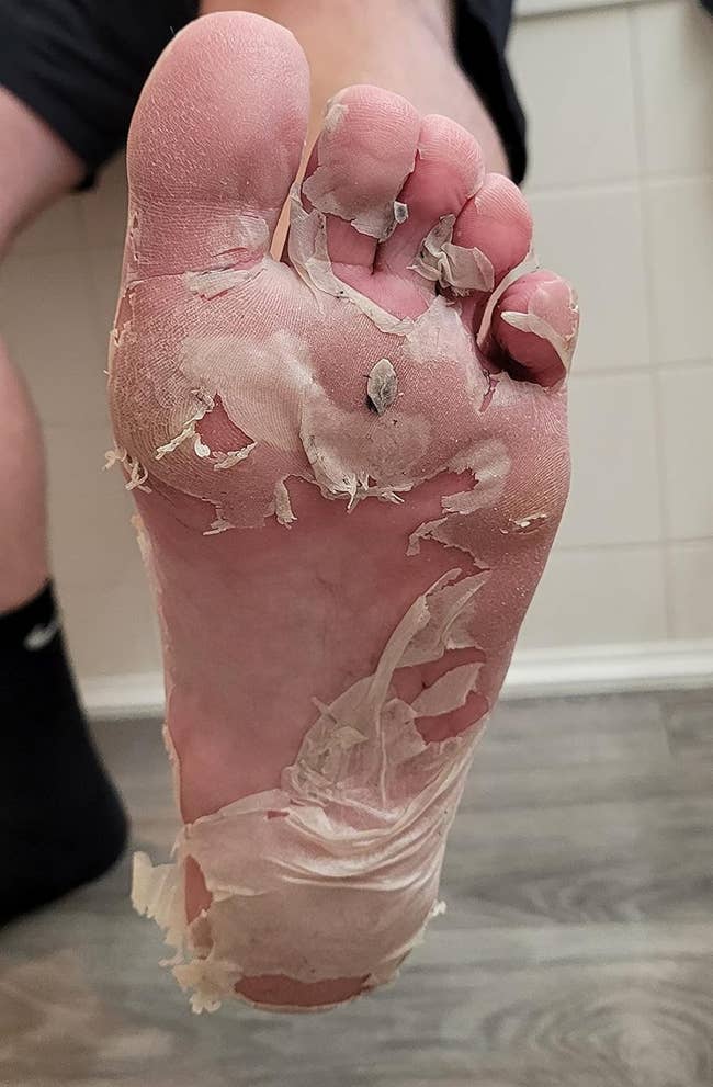 Promising review: "This foot peel is THE TRUTH and got my feet right and smooth as butter! I’ve never done a foot peel in my life and so I had a lot of hard skin under my foot to get rid of. The shipping was super fast, I think I received it in like three days! I followed the instructions on the box, and decided to put on the foot peel on right before bed. You can feel the peel tingling and working while you have it on your feet so I felt relief. It took about three days after I did the peel to see the results starting. Do not get discouraged if you see peeling only at the toes. That’s just the start of it...cause the next day I felt the mid of my foot arch bubble after my bath and a whole piece of skin was peeling. This peel did its job and some more! It has my feet feeling baby smooth! This peel gave me a feeling of being in a salon without the polish. It felt good to pamper myself. This is my go-to from now on, when I want a good smooth foot AFTER a pedicure (because a pumice stone can’t do what this peel can)!" —Shopinista