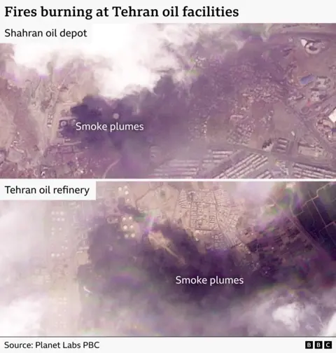 Smoke plumes caused by oil depot and refinery strikes drifted across Tehran on Monday, satellite images show, as the World Health Organization (WHO) warned that attacks on oil facilities could pose serious health risks to residents. Since the US-Israeli attacks on Iran began on 28 February, we have confirmed strikes on at least four oil facilities around the capital. Residents said smog and pollution have blocked out the Sun and left a strong smell of burning in parts of the city, while experts warn the scale of some of the pollutants released could be "unprecedented". The spike in air pollution appears to focus near the damaged oil sites around the capital - a city with a population of nearly 10 million, with millions more in the surrounding areas. The latest satellite pictures, captured on 9 March and reviewed by BBC Verify, show two major oil facilities in Tehran still on fire, following reported air strikes overnight on Saturday. The images also show smoke coming from Shahran depot in the north-west of the Iranian capital and the Tehran oil refinery, in the south-east. Verified video of the moments after Saturday's strike showed huge fireballs illuminating the night sky at the refinery. The combination of cloud and smoke plumes from the ongoing fires mean that we are unable to assess the extent of the damage at either oil facility hit over the weekend yet. But images taken at Shahran on Sunday morning showed emergency workers inspecting burned out oil tankers, blackened buildings and blazing fires. The Israel Defense Forces (IDF) said it hit "fuel depots" near Tehran in a post on X on 7 March, which included a photograph showing damage to the Tehran oil refinery. BBC Verify provided the coordinates of this facility, along with three other locations we identified, to the IDF and the Pentagon for comment. The Pentagon did not reply, while the IDF said there were "no IDF strikes at those sites". We have asked for clarification. Strikes at oil refineries have the potential to bring significant air pollution because they contain a huge variety of chemicals. When there is incomplete burning of oil – when there is not enough oxygen - carbon monoxide and soot particles can be released instead of carbon dioxide and water. Oil fires can also release sulphur and nitrogen oxides, which can form acids if they dissolve in rainwater, as well as other harmful hydrocarbons, metallic compounds and droplets of oil. A Tehran woman in her 20s said that she could "smell the burning" caused by the attacks on oil facilities. "I can't see the Sun. There is a horrible smoke. It's still there. I'm very tired," she told BBC Persian on Saturday. A precise assessment of air pollution is challenging because there are no ground-based measurements available - and satellite data is hard to interpret due to winds, clouds and other factors. But given the mix of chemicals likely released from the damaged oil sites, scientists have little doubt that the pollution is harmful and extreme - and very different to the smog seen in cities like Beijing or Delhi. "What has happened [in Iran] is definitely unprecedented because it's all coming in from missiles dropping in and airstrikes on oil refineries," said Dr Akshay Deoras, research scientist at the University of Reading. Many conflicts cause high levels of dust and particle pollution - but the "basket" of different chemicals in this case is "definitely unusual", he added. Eloise Marais, professor of atmospheric chemistry and air quality at University College London, agreed. She said that in most circumstances this kind of pollution would only be seen from "a very, very severe industrial accident where an entire refinery explodes". On Sunday, Tehran residents reported downpours of "black rain". Black rain is the informal term for rainfall contaminated with pollutants, turning it dark. It is normal for pollutants to be "washed out" of the air by rainfall, but black rain is rare and typically is the result of high levels of soot and other air pollutants, scientists have told BBC Verify. "The raindrops acted like little sponges or magnets, collecting whatever was in the air as they fell, which is why residents observed what's being described as 'black rain'," explained Deoras. It is also possible that some larger particles may have fallen out of the air without rain. The head of the WHO has already expressed "great concerns" for the impacts of the conflict on people's health. Damage to oil facilities "risks contaminating food, water and air – hazards that can have severe health impacts especially on children, older people, and people with pre existing medical conditions", said Dr Tedros Adhanom Ghebreyesus. "These very intense exposures of particulates have immediate impacts on the lungs," added Anna Hansell, professor of environmental epidemiology at the University of Leicester. "But they can also have quite long lasting effects over many years afterwards, on both respiratory systems and increasing cancer risk." Doug Weir, director of the Conflict and Environment Observatory, noted that "what's unusual about Tehran is we haven't observed these attacks in such a densely populated area before". "Often these oil field sites are quite far out in the countryside. People in Tehran are exposed to a huge range of substances in this black rain - not just oil," he said. BBC Weather forecasts suggest spells of rain on Tuesday and again from Thursday onwards, as well as a stronger breeze. That should help to disperse and wash pollutants away. But that does not mean the risks of the pollutants disappear. They can enter rivers and other waterways, or if they settle and the ground dries then winds can pick them up and they can become resuspended in the air. This story has been updated with a statement from the IDF which was received after publication. Additional reporting: Ghoncheh Habibiazad, Paul Brown, Rollo Collins, Shayan Sardarizadeh, Farida Elsebai and Daniel Wainwright What claim