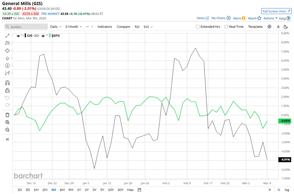 With a market cap of $23.2 billion, General Mills, Inc. (GIS) produces and markets a wide range of branded consumer foods, including cereals, snacks, baking products, frozen meals, ice cream, and pet food through segments such as North America Retail, International, North America Pet, and North America Foodservice. Companies valued at $10 billion or more are generally considered "large-cap" stocks, and General Mills fits this criterion perfectly. Its products are sold worldwide through grocery stores, mass merchandisers, e-commerce retailers, restaurants, and specialty pet stores under well-known brands like Cheerios, Betty Crocker, Pillsbury, and Häagen-Dazs. Dear Oracle Stock Fans, Mark Your Calendars for March 10 As Elon Musk Aims for AGI, Should You Buy Tesla Stock Now? Stocks Close Higher After President Trump says Iran War is "Pretty Much" Complete Markets move fast. Keep up by reading our FREE midday Barchart Brief newsletter for exclusive charts, analysis, and headlines. Shares of the Minneapolis, Minnesota-based company have dipped 33.1% from its 52-week high of $64.95. Shares of General Mills have declined 4.9% over the past three months, underperforming the broader S&P 500 Index’s ($SPX) marginal drop during the same period. The company’s shares have decreased 6.7% on a YTD basis, lagging behind SPX's marginal decline. Longer term, GIS stock has dropped 32.7% over the past 52 weeks, compared to the 17.8% return of the SPX over the same time frame. The stock has been trading below its 50-day and 200-day moving averages since last year. Shares of General Mills rose 3.4% on Dec. 17, 2025, after the company released Q2 2026 results. The company highlighted strong growth drivers, including expectations that new product innovation will increase about 25% this year and reported market share gains in 8 of its top 10 categories, signaling improving demand. Investors were also encouraged by the Love Made Fresh pet food rollout reaching 4,658 coolers with a target of 5,000 by January and about 5% market share, along with management’s outlook for top-line improvement in the second half and profit growth in Q4. In comparison, GIS stock has lagged behind its rival McCormick & Company, Incorporated (MKC). MKC stock has declined 5.8% on a YTD basis and 22.3% over the past 52 weeks. Due to GIS stock’s underperformance, analysts are cautious with a consensus rating of "Hold" from 20 analysts. The mean price target of $49.53 is a premium of 14.1% to current levels. On the date of publication, Sohini Mondal did not have (either directly or indirectly) positions in any of the securities mentioned in this article. All information and data in this article is solely for informational purposes. This article was originally published on Barchart.com