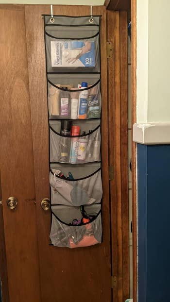 Promising review: "Great way to get a little extra storage space without taking up more space. I have a set of these on my bathroom door for extra toothbrushes, cotton swabs, shampoo, etc. I have another on the inside of my basement door with extra cleaning supplies. They hold a good amount of items/weight. The only issue I have is that they rub at the top of the doorframe. The door and frame are pretty tight, so anything placed over it would do the same. Definitely worth the quality and price." —amazon customer