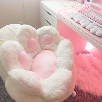 Promising review: "I freaking LOVE this paw cushion! This paw cushion absolutely saves my butt. It's not super thick or as filled as you might hope. But I read reviews and was prepared for that. A little extra padding would be great, but even without it, this cushion is soft and comfy! It's still worth every dime. It's perfect if you have one of those hanging indoor/outdoor rope chairs, too! This cushion is soft, cute, and comfortable. Buy yourself this thing. You deserve it." —mandarabbit