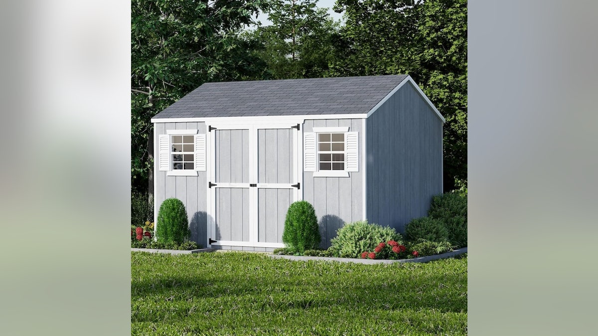 Store tools and lawn equipment in this outdoor shed that's made of weather-resistant materials. It withstands rain, wind and sun and ships with pre-cut panels and double doors for easier assembly.