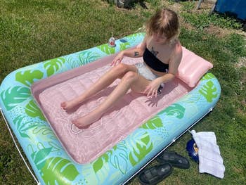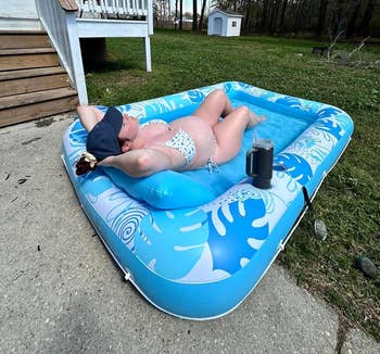 Promising review: "This is seriously the best 'lounge tanning chair' I have ever had! I don’t have a pool, and most days I have some time to lie out and enjoy the sun for an hour or two. This thing is soooo comfortable, and the pillow is perfect! Just add however much water you want to keep cool, get your favorite playlist out and a refreshing drink, and get your tan on in your backyard or deck! Buy it! It’s worth every penny." —Amazon Customer