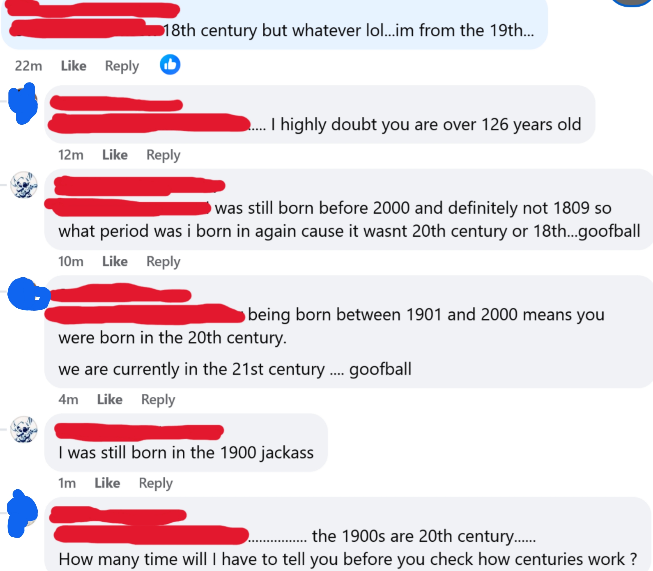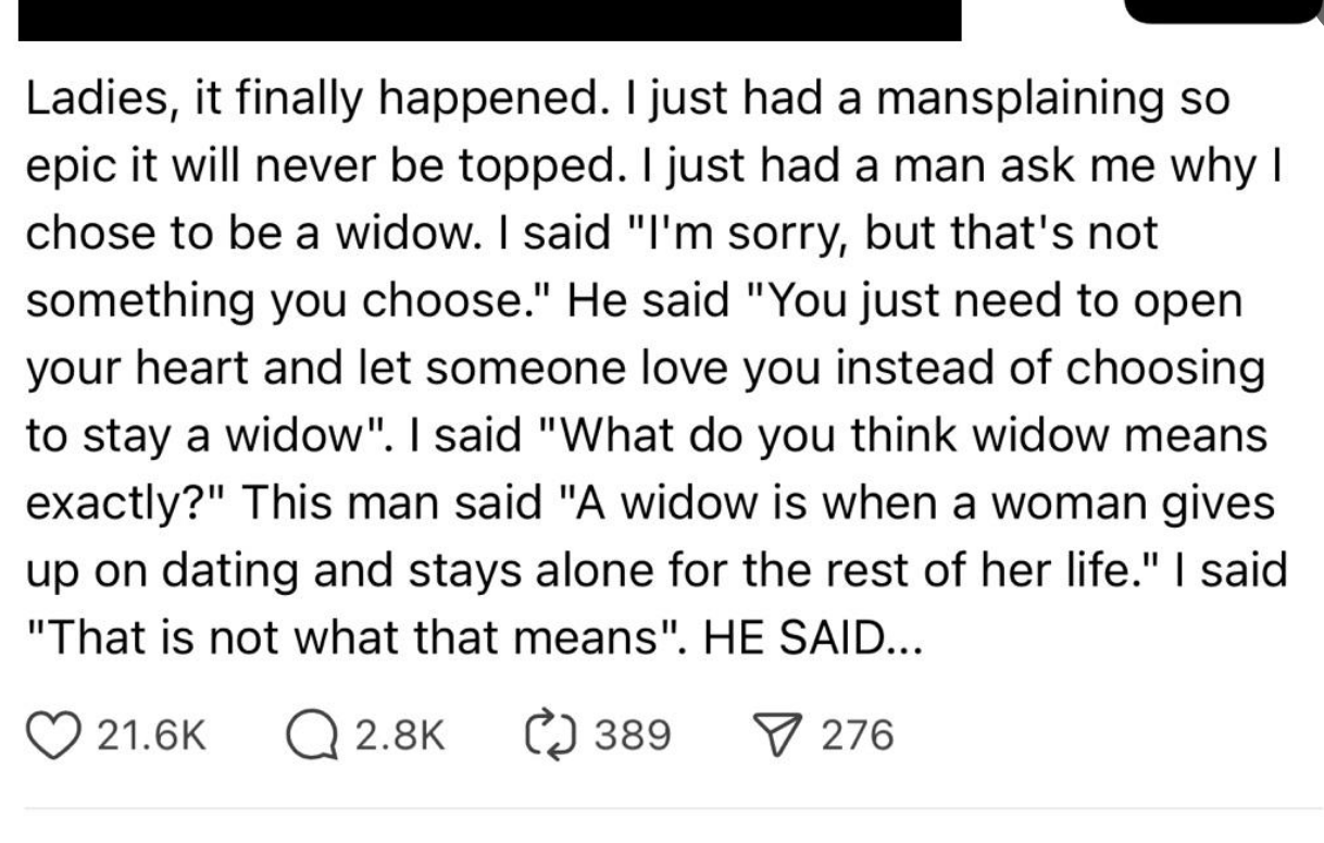 I don't understand how someone can think 120 minutes is the same thing as an hour and 20 minutes. I'm a Senior Staff Writer who writes a wide range of topics, spanning from people's real-life drama to pop culture to funny things I find on the internet. "I was just about to check FB Marketplace for a Sony Lens after some Reddit scrolling. Nevermind. Unfortunate situation, luckily it's caught on camera. A few hundred dollars isn't worth dying over." "Dye = a natural or synthetic substance used to add a color to or change the color of something. Learning the meaning of words before posting isn't difficult. Dieing means to die. As in death or not alive. Additionally, never mind is two words, not one." Post:“Did you know: mammals cannot be green.” Reply by user 1:“Kermit would like a word” Reply by user 2:“Kermit is not a mammal” Reply by user 1:“Lmao of course he’s a mammal his surname is literally ‘the frog’” “The president, and the president alone, has the authority to decide how to allocate funding. Nobody has the right to review or pass judgement on his actions.” Comment 1:“18th century but whatever lol...im from the 19th...” Reply by user 1:“.... I highly doubt you are over 126 years old” Reply by user 2:“was still born before 2000 and definitely not 1809 so what period was i born in again cause it wasnt 20th century or 18th...goofball” Reply by user 1:“being born between 1901 and 2000 means you were born in the 20th century.we are currently in the 21st century .... goofball” Reply by user 2:“I was still born in the 1900 jackass” Reply by user 1:“................ the 1900s are 20th century......How many time will I have to tell you before you check how centuries work ?” “Ladies, it finally happened. I just had a mansplaining so epic it will never be topped. I just had a man ask me why I chose to be a widow. I said "I'm sorry, but that's not something you choose." He said "You just need to open your heart and let someone love you instead of choosing to stay a widow". I said "What do you think widow means exactly?" This man said "A widow is when a woman gives up on dating and stays alone for the rest of her life." I said "That is not what that means". HE SAID...” Comment by user 1:“Poor thing. I'm not eating beef anymore.” Reply by user 1:“The only problem is... beef is in all of my favorite foods (Spaghetti bolognese, hot dogs, hamburgers etc..) so now I don't know what to even eat, lol.” Reply by user 3:“HAMburgers aren’t beef. Neither is hotdogs. They’re pig” Post: "Spanish is a LANGUAGE 🥴🥴🥴🥴 people aren't Spanish 😭🥴" “There’s no thing as 'Rabies', it’s never been proven to exist. Rabid animals are usually starving and in a highly stressed state. I’d wash my wound with CLO2 and not worry about it.” “How about just don’t cheat on your spouse and then they won’t divorce you over infidelity” “Cheating makes marriages stronger, sexual frustration ruins them.” “Proof that airplanes aren't real. We don't have that kind of technology as humans, it's impossible to fly in the air. Throw a feather into the air and it comes down. No way thousands of pounds of metal is able to fly. When you book a flight it's using demonic technology, using demon energy to transport you to your destination. The "X-rays" at tsa transmit signals to your brain to convince you that this demonic technology is actually human technology. I will never fly in a "airplane" the airplanes you think you see are holograms using the same demonic technology. Even if we could somehow fly using non demonic human technology the government wouldn't let us , because it would prove the earth is flat” “The Sun hasn't been invented yet. No we can't make something like that happen. Yes you can pretend you have a formula for what compounds you need, but nothing does what the Sun is said to do. We need something that can have other objects move around it and off the ground going around it. Plus we need it also happening without power leading into it, like an electric powering up to it, etc. All that has to be operating off world and in a vacuum known as space. Very tricky to prove that's what this is that people say it is. Proving is done using experimentation and that's not proven in any way shape or form.” "Why can’t you give a baby under a year honey?" Comment 1:“Am I the only one thinking that honey has to be some sort of like golden formula that you should give your babies as much as possible if the government is trying so hard to push against it? 🤔” Reply (Author):“I was actually thinking kinda the same. I don’t trust the WHO or FDA” Comment 2:“I gave my boys honey before the age of 1. I do not nor will never trust anything that the FDA, WHO, or