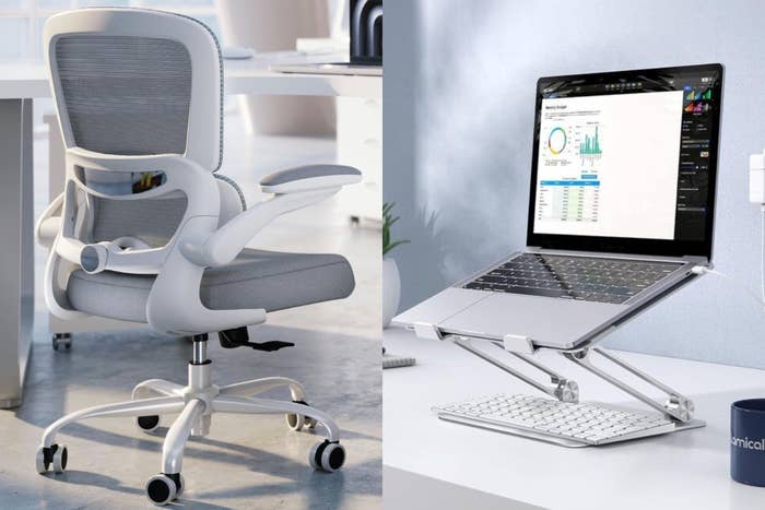 We hope you love our recommendations! While every product is independently chosen by our editors, BuzzFeed and our publishing partners may collect a share of sales or other compensation from the links on this page. You can read more about how our affiliate partnerships work in our Editorial Standards & Ethics Guide. Standing desks, ergonomic chairs and other affordable office additions that will nip this harmful habit in the bud. Alan Hedge, an ergonomics expert and professor emeritus for the human-centered design department at Cornell University, recently spoke with our reporter Monica Torres about desk shrimping and its risks. According to Hedge, despite its endearing name, being a desk shrimp comes with some long-term health risks. “You are creating a lot of muscle tension in the back as your body leans forward. You’re actually reducing air capacity to the lungs [and] restricting blood flow as you lean forward,” Hedge previously said. Even everyday headaches and body aches can be to blame. He said that, over time, this compression and added tension can cause injury either in the elbow, wrist, hip, neck or back, and can even cause conditions such as carpal tunnel syndrome, or even worse, disc degeneration. “The key to comfort and good health is to do computer work in a neutral posture – that means all parts of the body are in a comfortable range of motion,” he said. Hedge offered several adaptive habits that can help you maintain a position of neutrality and motion, but these changes are best achieved with the right desk items and setup. I reached out to Hedge myself to find out exactly what those office essentials were and how to use them. See his suggestions compiled in the list ahead. The experts consulted for this story do not necessarily endorse the products ahead unless otherwise noted. "Most computer work is done while seated – it stabilizes the body and is 20% less tiring than standing," Hedge said. For this reason, he claims that it's necessary to have a good ergonomic chair with easy auto recline, good low back support and allows for easy back movement while constantly supporting the back. "The chair should have a height-adjustable seat and height-adjustable armrests, [as] these reduce the strain of standing up and sitting down in the chair," he added. Based on these parameters, we found this under-$130 office chair that offers a unique recline function, allowing you to tilt the backrest (up to 120 degrees) or sit upright freely. With a load capacity of 330 pounds, this 360-degree swiveling chair has both a height-adjustable seat and armrests, plus ergonomic lumbar support that can be adjusted, depending on the degree of bolstering you need for your lower back. Get it from Amazon for $108.28+ (available in 16 colors). Hedge tells us to think about how someone sits to drive a car: the pedals are sloping upwards so the foot can rest comfortably on them while in a sitting back position. "In the same way, a sloping footrest is a great product to help the user sit back in their chair," he said. "If the footrest can also be rocked by the feet. This improves circulation and is less tiring over time." He didn't mention a specific brand, so we chose this popular option that's won 4.6 out of 5 stars on Amazon and has close to 14,000 ratings. Made from a high-density memory foam, this height-adjustable foot rest features a non-slip base to keep it in place, and can be turned upside down to allow for a rocking motion, as Hedge suggests. Get it from Amazon for $35.99+ (available in two shapes and three colors). "When sitting back, your [computer] screen center should be around eye level," Hedge said. "For that, a desktop monitor can be placed on a monitor arm, which makes it very easy to adjust position (height, angle)." We selected this adjustable monitor arm for its 4.6 out of 5-star rating on Amazon, across 15,600+ reviews. It promises great adaptability across a variety of monitor types and stability. Once your monitor is attached using the quick screw installation, your screen can tilt, swivel and rotate 360 degrees. Get it from Amazon for $35.99+ (available in two colors). If you don't use a large monitor and are just bound to a laptop for work, then Hedge suggests using a laptop riser and a separate keyboard and mouse, which achieves the same thing as a monitor arm and keeps the head and neck in a neutral posture. We found this laptop riser and Bluetooth keyboard and mouse set, which, together, offer ergonomic functionality for laptop users. The portable laptop riser, which is compatible with laptops up to 17.3 inches, can securely hold computers at a posture-appropriate angle. The ergonomic keyboard is also tilt-adjustable and comes with a detachable magnetic wrist rest and comes in a variety of color options. Get them from Amazon: the riser for $35.99+ (available in five colors) and the keyboard and mouse for $32.29+ (available in 27 colors). "If working with paper documents, a document holder is great because it raises the paper to eye level, which minimizes neck strain," Hedge said. This is a popular choice by 3M, which features a frame-style design that keeps documents secure and upright using a height-adjustable clip and a non-slip base. It can hold up to 150 standard sheets of paper at a time and can fold flat when not in use. "A freestanding task light can also be helpful for shining light on paper documents without shining light on the computer screen," Hedge said. We took his suggestion and selected this sleek and dimmable LED desk lamp that features five light modes and five brightness levels, including soft, warm lighting to reduce eye fatigue. This space-conscious light is also height-adjustable with a tilting arm. Get it from Amazon for $21.99 (available in two colors). Experts previously spoke to us about the benefits of posture garments, such as posture bras and T-shirts. Based on this guidance, we covered this popular full-back posture brace, which is
