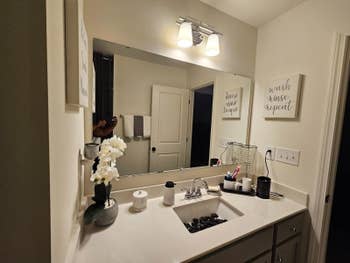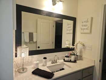 Promising review: "Where do I start? I absolutely LOVE this product. I wanted to replace our bathroom mirror, but due to the size, it would have cost a lot! I came across this on Amazon and decided to give it a try. The application process was super easy and applied without bubbles as long as you go slow and rub it down as you go. I kid you not. It looks like wood and feels like it, too! You can feel and see the 'wood grain.' It’s absolutely stunning and looks like I bought a whole new mirror." —Taylor