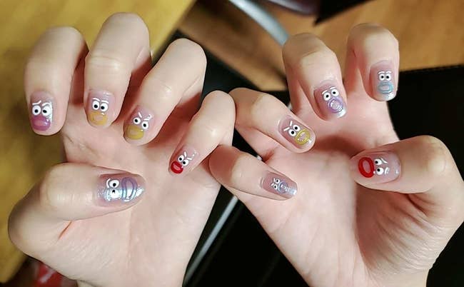 Promising review: "These nail stickers are sooooooooooo cute!!!!!!! The stickers are super thin and of good quality! It could be easily removed from the sheet using the tweezers given in the package (as long as you get the hang of it, it might take one or two tries), even if you accidentally stretched, bent, or pulled the clear edge part of the nail stickers, it is barely noticable after putting on one or two coats of clear top coat. The package contains two sheets of stickers, one with solid mouth colors and the other has half clearish, Jell-O-looking mouths. (The one I used on the picture is the Jell-O mouth one.) It also comes with a tweezer that is easy to use after getting the hang of it. Definitely worth the price!!!!!" —Angela W.
