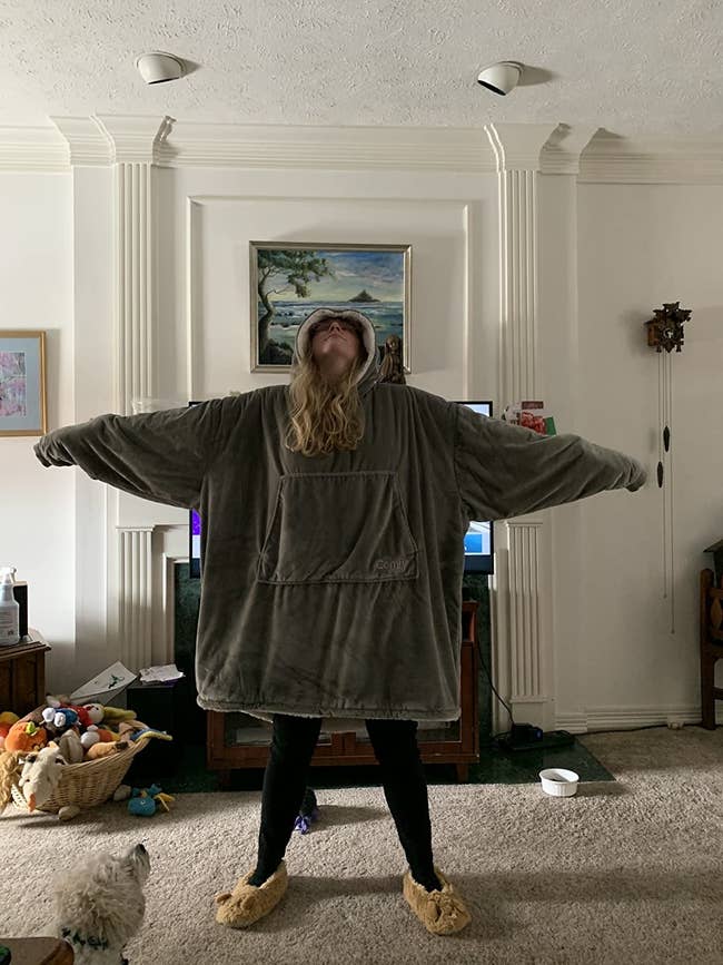Promising review: "This is the best thing I've ever bought. I love it, my dog loves it, and my friends are envious. It feels like being wrapped up in the best blanket ever. I'm short (5'0") and wide (~2x–3x), and this fits perfectly loose. I wish the sleeves were shorter, but I know that I have dinosaur arms, and for people with longer arms, it probably fits better. Wish the pocket was lower too, but it's nice and big, and I can fit my phone and probably a small child in it. It does attract dog hair, but it brushes right off. Didn't notice any issues with stitching/quality. I know what I'm getting people for Christmas if I run out of ideas." —Amazon Customer
