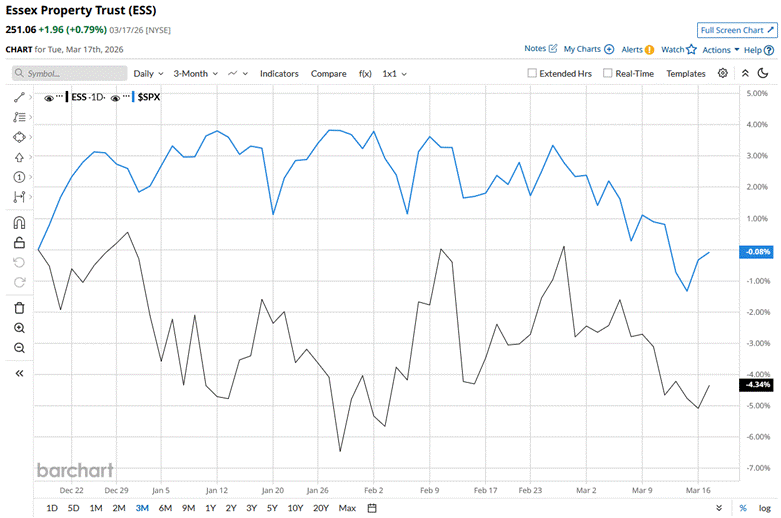 When stacked against its peer, Equity Residential (EQR), ESS has underperformed. Over the past year, EQR stock has declined 12.9%, outperforming ESS stock.