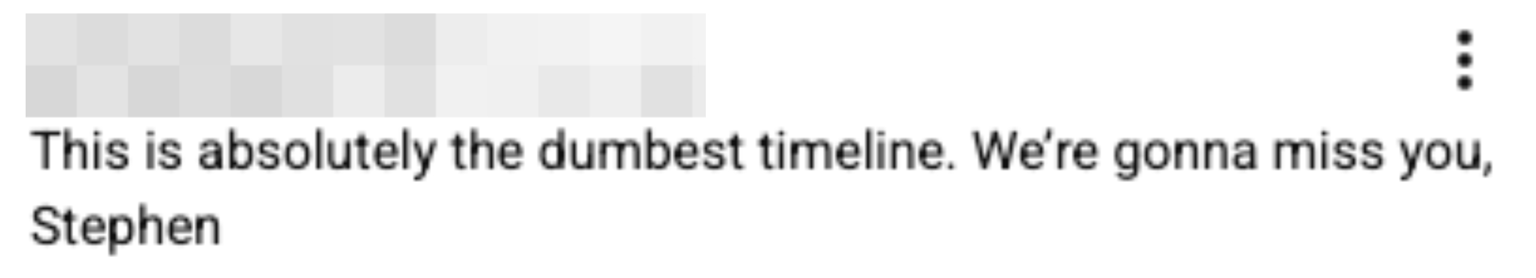 "This is absolutely the dumbest timeline. We're gonna miss you Stephen."