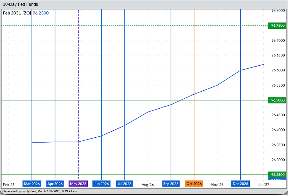 The Fed fund futures forward curve shows contracts priced between 96.5 and 96.75 through the October 2026 issue. This tells us the market is not pricing in a cut in the Fed fund rate until at least the October 2026 meeting. This will not sit well with the US White House that is demanding lower rates despite the increased concern over long-term inflation caused by the War in Iran. Early Wednesday afternoon, US Fed Chairman Jerome Powell will step to the microphone and announce the Fed fund rate will stay unchanged for the time being based on continued concerns over inflation and the labor market. There won’t be any fireworks or grandiose statements. Chairman Powell will make his comments then answer as many questions as possible from the press, even those from Faux News. And life will go on. Am I psychic, knowing this is how the day will play out? No. A look at the Fed fund futures forward curve early Wednesday morning shows futures contracts are pricing in an unchanged Fed fund range between 3.5% and 3.75% through the October 2026 issue (ZQV26). Let's walk through the calculations based on the price of futures contracts (1% - Futures Price = Expected Rate) Crude Oil Rallies as Iranian Attacks Disrupt Middle Eastern Supplies Nat-Gas Prices Gain as Iran Attacks Key Energy Infrastructure Crude Oil Prices Gain as Iran Renews Attacks on Middle East Energy Infrastructure Our exclusive Barchart Brief newsletter is your FREE midday guide to what's moving stocks, sectors, and investor sentiment - delivered right when you need the info most. Subscribe today! March at 96.375 = 3.625% April at 96.36 = 3.64% May at 96.36 = 3.64% June at 96.38 = 3.62% July at 96.415 = 3.585% August at 96.465 = 3.535% September at 96.49 = 3.51% October at 96.52 = 3.48% November at 96.555 = 3.445% December at 96.605 = 3.395% January 2027 at 96.625 = 3.375% February 2027 at 96.64 = 3.36% Over the next year, the US Federal Open Market Committee has meeting scheduled for: March 17 and 18 April 28 and 29 June 16 and 17 July 28 and 29 September 15 and 16 October 27 and 28 December 8 and 9 January 2027 26 and 27 If the FOMC cuts its rate by 25-basis points at the conclusion of the October meeting, as indicated by the Fed fund futures forward curve at this writing, the range would drop to 3.5% to 3.25% (dashed green line, top of chart). Note futures contracts out through the February 2027 issue are nowhere near indicating a second rate cut, the futures market needing a price of 96.75 or higher. Recall from the minutes of the January 2026 meeting that a divided Fed decided “further interest rate cuts should be paused for now and could resume later in the year only if inflation cooperates”. What has happened since the end of the January meeting? Due to the US starting a war in Iran: Crude oil (CLJ26) has gained as much as 83% in price RBOB gasoline (RBJ26) is up as much as 61.5% and Diesel fuel (distillates, heating oil, jet fuel, etc.) (HOJ26) has added as much as 60% Additionally, the commodities complex in general has rallied on F.O.I.L (Fear Of Inflation Long-term) from global investors. The US soybean market (ZSK26) rallied as much as 16% on not necessarily the Truth Social media posts regarding China buying soybeans from the US. All while Brazil’s record large harvest continues to make its way to port. The Cash Gold Index (GCY00) has added as much as 11% as a safe-haven market against both the new War and old inflation fears. But the Cash Copper Index (HGY00) is down 3% over concern of an economic slowdown. As for other markets of interest tied to the US FOMC and the Fed fund rate: The US dollar index ($DXY) has gained as much as 3.5% on the idea rates won’t be cut again any time soon due to F.O.I.L. The S&P 500 ($INX) has lost as much as 315 points (4.5%) with The Dow Jones Industrial Average ($DOWI) down as much as 2,400 points (4.9%) Wednesday’s Fed decision, announced by one of the US president’s many nemeses, Fed Chair Powell, will likely ignite a string of angry social media posts designed to influence markets both domestically and globally. We know the US president has already named Mr. Powell’s replacement, for now starting with the June 2026 meeting. But what happens if the market is correct and this new puppet Chairman does not immediately lower rates? Will the US president break out his well-known reality television line, “You’re fired!” and name a chairman who will lower rates regardless of inflation? Time will tell. On the date of publication, Darin Newsom did not have (either directly or indirectly) positions in any of the securities mentioned in this article. All information and data in this article is solely for informational purposes. This article was originally published on Barchart.com
