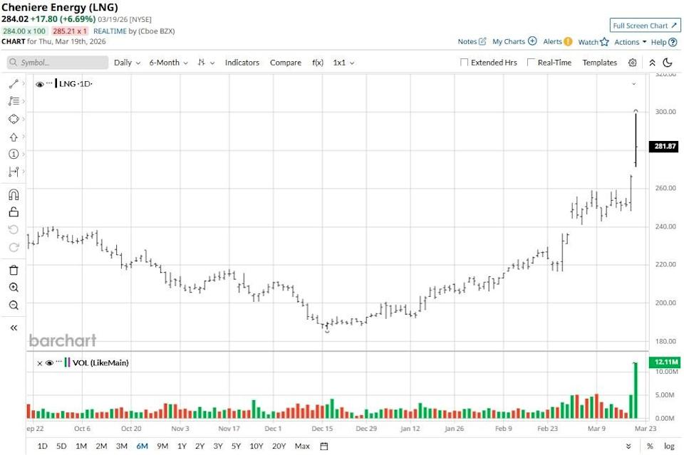 Cheniere Energy (LNG) stock pushed meaningfully higher, hitting an all-time high of nearly $297 today following a missile attack on Qatar’s Ras Laffan industrial complex. The price action drove LNG’s relative strength index (14-day) into the early 80s, signaling deeply overbought conditions that often precede a sharp correction. Crude Oil Prices Erase Gains on Hopes US to Add Supplies to Oil Markets Goldman Sachs: Every $10 Jump in Oil Could Add 0.3% to U.S. Inflation Is U.S. Natural Gas Entering a New Era? Get exclusive insights with the FREE Barchart Brief newsletter. Subscribe now for quick, incisive midday market analysis you won't find anywhere else. Year-to-date, Cheniere stock is now up more than 40%, but there’s reason to believe that this LNG exporter will rip higher from here in 2026. Iran’s attack on the Ras Laffan terminal is structurally bullish for LNG shares because it eliminates a huge chunk of global supply, effectively driving a sharp increase in international spot prices. With nearly 20% of Qatar’s export capacity now sidelined for years, European and Asian utilities are forced to pivot toward reliable U.S. Gulf Coast supply to mitigate energy security risks. This shift allows Cheniere to capture higher margins at its Sabine Pass and Corpus Christi facilities. Moreover, the multi-year delay of the North Field East expansion creates a long-term supply deficit, positioning Cheniere to lock in lucrative long-term contracts as the primary alternative for “safe-haven” liquified natural gas. A 0.79% dividend yield makes LNG even more attractive to own in 2026. Beyond the Iran war, Cheniere Energy shares remain attractive as a long-term holding due to the firm’s aggressive capital allocation and expanding global footprint. LNG has negotiated an expansion to its 15-year agreement with Thailand’s PTT, increasing annual deliveries to 1.3 million tonnes through 2041, which strengthens long-term visibility for investors. Additionally, the company demonstrated its ability to secure low-cost growth as it closed $1.75 billion in long-dated senior notes to fund the Corpus Christi expansion. Most importantly, Cheniere’s board has recently authorized another $10 billion in share repurchase, signaling massive confidence in future cash flows. Despite an extremely overbought RSI, Wall Street firms remain bullish as ever on LNG stock for the next 12 months. According to Barchart, the consensus rating on Cheniere Energy sits at “Strong Buy,” with price targets as high as $301, indicating potential upside of another 8% from current levels. This article was created with the support of automated content tools from our partners at Sigma.AI. Together, our financial data and AI solutions help us to deliver more informed market headline analysis to readers faster than ever. On the date of publication, Wajeeh Khan did not have (either directly or indirectly) positions in any of the securities mentioned in this article. All information and data in this article is solely for informational purposes. This article was originally published on Barchart.com