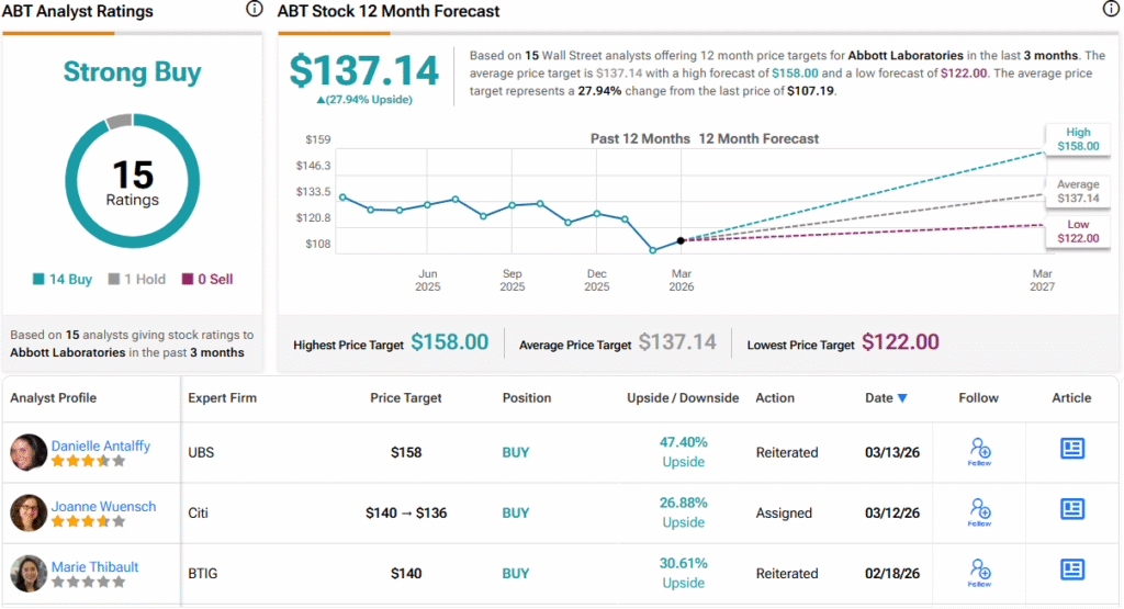 For years, the conversation around getting older has focused on individuals – retirement, lifestyle, healthcare. But a bigger story has been quietly unfolding in the background. The U.S. population itself is aging, and that shift is starting to ripple far beyond personal milestones. Unlock hedge fund-level data and powerful investing tools for smarter, sharper decisions Stay ahead of the market with the latest news and analysis and maximize your portfolio's potential The Chief Investment Office at UBS views this trend as a foundation for long-term portfolio positioning. It frames “longevity” as a structural theme – a growing, aging population with evolving needs, particularly in areas like healthcare. Healthcare is set to play a central role among longevity-focused investments, while other sectors will need to adjust to changing demand patterns. The opportunity is substantial for companies and investors that recognize the broader trend. Laying out the situation, the UBS team writes: “We estimate that the annual longevity market opportunity was USD 5.3 trillion in 2023 and will grow by an incremental USD 2.5 trillion to reach total annual revenues of around USD 8 trillion by 2030… Our longevity portfolio theme is currently dominated by the health care sector, with the companies we expect to drive the longevity curve inflection carrying the largest weights. Medical device companies that both enable greater lifespan and benefit from growth in the elderly demographic also have significant weighting in our Longevity Equity List.” Against this backdrop, UBS analysts are highlighting stocks tied to the longevity theme, targeting companies positioned to capture a share of the $8 trillion aging-driven opportunity. We turned to the TipRanks database to examine two of their selections and the thinking behind them. Abbott Laboratories (ABT) The first company we’ll look at, Abbott Laboratories, was founded in 1888 – and has built itself into a major player in the realm of medical devices and other health care products. The company has a diverse line of products, in such areas as pain and movement; diagnostic testing; cardiovascular health; nutrition; and diabetes. All of these fields – and more that Abbott Labs works in – have clear applications to the larger field of elder care. Two fields in particular draw attention when we look at Abbott. The company’s FreeStyle Libre product is a leader in the continuous glucose monitoring (CGM) market, a vital technology in controlling and managing diabetes. Abbott’s product boasts that it is the leading CGM brand in the US. Abbott’s cardiovascular products include devices to manage such conditions as heart failure, irregular heartbeat, and mitral regurgitation. Diabetes and cardiovascular disease are two of the leading causes of death, and Abbott’s work has put smart, effective treatments on the market. The company is also known for such products as concussion assessment devices, important in the treatment of mild traumatic brain injuries, and its line of Ensure nutrition products. Like the company’s diabetes and cardiovascular products, the Ensure nutrition supplements are widely used in elder care. Turning to the company’s financial results, we find that Abbott’s last report, covering 4Q25, showed weak top-line results, and the shares fell sharply after the release. Total sales came to $11.46 billion, and were up 4.4% year-over-year, but the figure missed the forecast by $342.9 million. Abbott’s Medical Devices segment was the strongest sales driver, generating $5.675 billion in sales, for a 12.3% year-over-year gain. The nutrition segment led the losses, falling 8.9% from 4Q24 to land at $1.94 billion. At the bottom line, however, Abbott Labs’ $1.50 non-GAAP EPS was up almost 12% from the prior-year period, and beat the estimates by a penny. While the market has punished the company for the weak topline result, UBS analyst Danielle Antalffy expects sales to pick up. She writes, “We expect ABT’s growth to continue accelerating over the next few quarters and believe ABT is well positioned to benefit from an aging population. ABT’s leading position in the CGM and cardiovascular markets enable it to both drive better health outcomes and benefit from an aging population. In addition, ABT’s Nutritionals business should see demand increase from an aging population. We think an acceleration in growth combined with a potential resolution to ABT’s infant formula litigation will drive a higher valuation.” Quantifying her stance, Antalffy put a Buy rating on ABT, along with a $158 price target that implies a 47% gain in the coming months. (To watch Antalffy’s track record, click here) Wall Street clearly agrees that this stock has potential. ABT has a Strong Buy consensus rating, based on 15 recent reviews that show a lopsided 14 to 1 split in favor of Buy over Hold. The stock’s $107.19 trading price and $137.14 average target price together indicate a 28% one-year upside potential. (See ABT stock forecast) Alcon, Inc. (ALC) The second stock on our UBS-backed list, Alcon, is a Swiss-American company in the health care niche. Specifically, this Geneva, Switzerland-headquartered company has put together a portfolio of eye care devices, a portfolio designed to correct a number of common vision problems. Alcon’s product lines include both surgical items and vision care products. The company, which boasts a market cap of $37.7 billion, has a global footprint, operating in more than 140 countries. Alcon employs over 25,000 people. This eye-care firm is known for its lines of innovative products, and for its ability to create and develop partnerships with professionals in the eye-care field. Alcon’s niche is strong, and the company benefits from having a very large potential customer base. According to company estimates, there are approximately 65 million people around the world dealing with vision loss from cataract