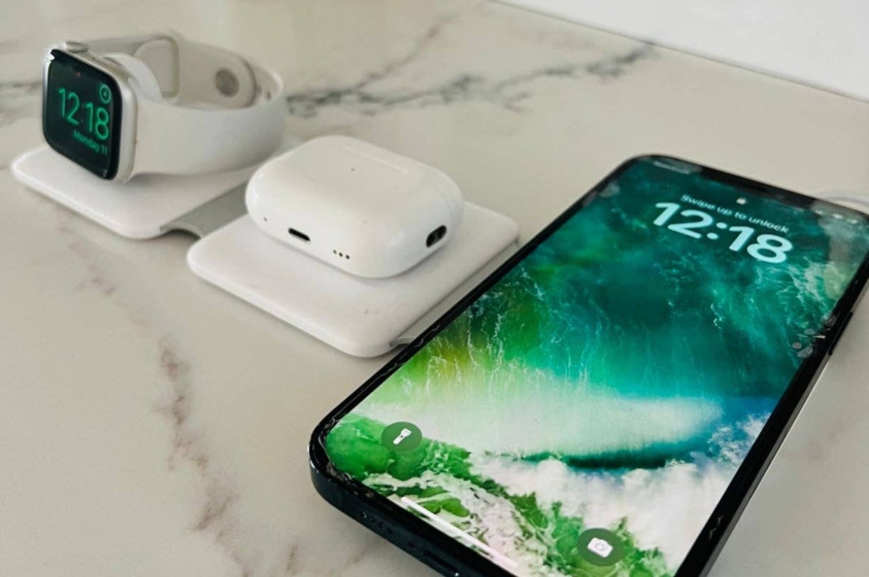 Promising review: "I finally gave up and bought a charging station for several devices. I travel a lot, and taking turns charging my iPhone, AirPods, and Apple Watch was annoying, especially if the room had a limited number of outlets and I was not the only one who needed to charge all of them ASAP — plus, hauling all of the cords. Ugh. Hooray, I'm hustle-free now. It comes with one fold-up station, one cord, and one nob for three devices that charge simultaneously. It works with my iPhone 12 Pro Max from 2020, Apple Watch Series 6 from 2020, and AirPods Pro (2nd generation) from 2022 without issues. I am more than satisfied with the purchase." —Sneaky Pete