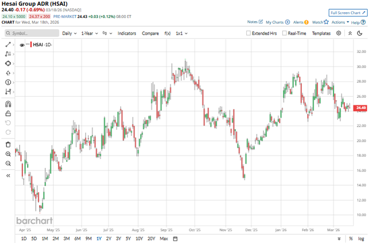 Recently, Hesai Group (HSAI) joined NVIDIA's (NVDA) Halos AI Systems Inspection Lab, the first ANSI National Accreditation Board (ANAB) accredited inspection lab for AI-driven physical systems. As a member of this lab, Hesai will evaluate and validate its LiDAR (Light Detection and Ranging) platforms within this unified AI compliance, safety, and cybersecurity framework. Earlier, the company was selected by NVDA to enable level 4 fleet deployment for NVIDIA DRIVE Hyperion 10, a compute-and-sensor architecture. Physical AI is gaining significant traction, especially as NVDA eyes a major push to accelerate the technology. This push also places LiDAR at the forefront, and Hesai is likely to play a major role. 2 Top Defense Stocks to Buy Now as the Military Works to Reopen the Strait of Hormuz Elon Musk Is Still a ‘Huge Admirer’ of Jensen Huang and Plans to Keep Buying Nvidia Chips. Does That Make NVDA Stock a Buy on the Dip? Is Dell Stock the Big Winner After Super Micro’s Stunning Implosion? Our exclusive Barchart Brief newsletter is your FREE midday guide to what's moving stocks, sectors, and investor sentiment - delivered right when you need the info most. Subscribe today! According to one estimate, the physical AI market is expected to grow at a 32.5% CAGR to $49.73 billion by 2033. Against this backdrop, Hesai plans to double its annual production capacity in 2026 from 2 million units to over 4 million units, driven by accelerating demand for ADAS and robotics LiDAR. Headquartered in Shanghai, China, Hesai Group specializes in developing and manufacturing advanced three-dimensional LiDAR solutions for autonomous vehicles, robotics, and industrial applications. The company integrates in-house research, design, and production to deliver high-performance sensors used in advanced driver assistance systems, mapping, and logistics robots. With a global presence, Hesai focuses on innovation to meet growing demand in the automotive and automation sectors. The company has a market capitalization of $3.41 billion. Robust LiDAR demand in the autonomous driving and ADAS segments fueled revenue expansion and profitability turnaround, alongside strong sentiments. Over the past 52 weeks, the stock has gained 17,45%, while it has been up only marginally year-to-date (YTD). The company’s shares reached a 52-week high of $30.85 in September 2025, but are down 27% from that level. On a forward-adjusted basis, Hesai’s stock’s price-to-earnings ratio of 54.11x is significantly higher than the industry average of 14.41x. For the third quarter of fiscal 2025, Hesai reported 47.5% year-over-year (YOY) growth in its net revenues to RMB795.40 million ($111.73 million). Hesai Group's product revenues reached RMB790.10 million ($111 million), up 57% from the prior year’s same quarter. This growth stemmed primarily from higher sales of ADAS and robotics LiDAR products, fueled by strong demand across China and international markets. The company’s non-GAAP EPS grew significantly YOY to $0.28. For the fourth quarter (to be reported on Mar. 24, before the market opens), Hesai Group anticipates net revenues ranging from RMB1 billion ($140 million) to RMB1.20 billion ($169 million), reflecting a YOY growth of roughly 39% to 67%. Wall Street analysts are robustly optimistic about Hesai’s future earnings. For fiscal 2026, EPS is projected to surge 105.4% annually to $0.76. Last year, Wall Street analysts gave their bullish takes on the stock. Analysts at CICC initiated coverage of Hesai Group with an “Outperform” rating and a $23.50 price target, reflecting optimism about the company’s fundamentals and its ability to execute its business plan. Goldman Sachs analysts raised Hesai Group’s price target from $26.30 to $36 and maintained a “Buy” rating. The analysts cited expanding LiDAR adoption in China and upcoming global production as reasons for this price target update. In addition, Goldman Sachs is significantly bullish on Hesai’s fundamentals, expecting a net margin of approximately 21% by 2030. Last year, UBS analysts also initiated coverage of Hesai Group with a “Buy” rating and a $35 price target. UBS expects the company to become the world’s largest ADAS LiDAR supplier for passenger vehicles from 2025, driven by its partnerships with EV startups and autonomous mobility service providers. Analysts highlighted Hesai’s recent entry into the supply chains of top-selling domestic OEMs. Hesai Group has become popular on Wall Street, with analysts awarding it a consensus “Strong Buy” rating overall. Of the 12 analysts rating the stock, a majority of nine analysts have rated it a “Strong Buy,” two analysts suggest a “Moderate Buy,” while one analyst is playing it safe with a “Hold” rating. The consensus price target of $33.20 represents 47.6% upside from current levels. Moreover, the Street-high price target of $38.10 indicates a 69.3% upside. On the date of publication, Anushka Dutta did not have (either directly or indirectly) positions in any of the securities mentioned in this article. All information and data in this article is solely for informational purposes. This article was originally published on Barchart.com
