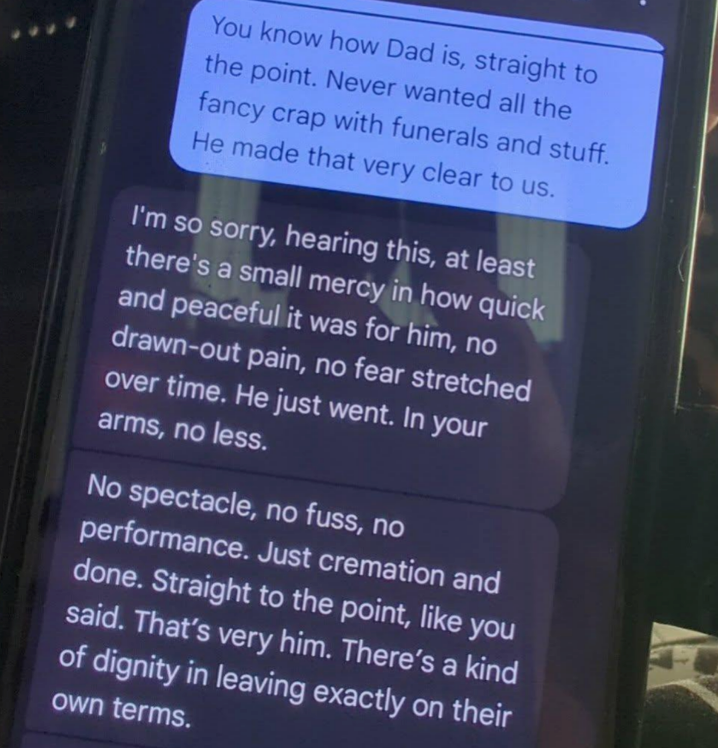 “I’m so sorry, hearing this, at least there’s a small mercy in how quick and peaceful it was for him, no drawn-out pain, no fear stretched over time. He just went. In your arms, no less. No spectacle, no fuss, no performance. Just cremation and done. Straight to the point, like you said. That’s very him. There’s a kind of dignity in leaving exactly on their own terms.”