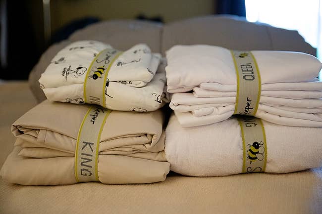 Promising review: "I have bought these beauties several times before and keep coming back because they are amazing. I use them to keep track of our different-sized sheets for all of our Airbnbs. They are very durable, don't lose their elasticity, and look absolutely adorable. Sheet keepers have been a lifesaver for me, as I have to wash so many sets of different sheets so often. You won't be disappointed." —Erica B.