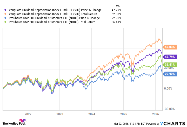 Both the Vanguard Dividend Appreciation ETF (NYSEMKT:VIG) VIG and the ProShares S&P 500 Dividend Aristocrats ETF (NYSEMKT:NOBL) target companies with a proven record of growing dividends. Their approaches, however, diverge. VIG tracks a broader swath of large-cap U.S. stocks with a dividend-growth tilt, while NOBL zeroes in on S&P 500 firms with the longest dividend growth streaks and applies equal weighting. VIG also stands out for its significantly lower cost and stronger historical returns, while NOBL offers a higher yield and a more focused, equally weighted approach to dividend growth stocks. This comparison unpacks how those differences show up in cost, performance, risk, and portfolio composition, helping investors make informed decisions. Metric VIG NOBL Issuer Vanguard ProShares Expense ratio 0.04% 0.35% 1-yr total return (as of 2026-03-21) 11.8% 5.7% Dividend yield 1.6% 2% Beta 0.81 0.76 AUM $123.8 billion $10.9 billion Beta measures price volatility relative to the S&P 500; beta is calculated from five-year monthly returns. The 1-yr return represents total return over the trailing 12 months. VIG is considerably more affordable, charging just 0.04% in annual fees versus NOBL's 0.35%, and it is also much larger in terms of assets under management. NOBL offers a higher dividend yield by 0.4 percentage points, appealing to those who prioritize current income. Metric VIG NOBL Max drawdown (5 y) -20.4% -17.91% Growth of $1,000 over 5 years $1,478 $1,229 NOBL holds nearly 70 stocks, with a portfolio that is equally weighted and sector exposure capped at 30%. As of its most recent data, the largest sector weights are industrials (22.5%), consumer defensive (22.09%), and financial services (13.08%). Its top holdings as of March 20 include Chevron (NYSE:CVX), ExxonMobil (NYSE:XOM), and Linde (NASDAQ:LIN), each making up just over 1.7% of assets. The fund has been around for 12.4 years, offering a focused yet diversified approach to U.S. dividend growth leaders. VIG, by contrast, casts a wider net with 338 holdings and a tilt toward technology (24.5%), financial services (20.6%), and healthcare (16.8%). Its largest positions as of Feb. 28 were Broadcom(NASDAQ:AVGO), Apple (NASDAQ:AAPL), and Eli Lilly (NYSE:LLY), each making up between 3.7% and 5.9% of total assets. For more guidance on ETF investing, check out the full guide at this link. For investors seeking a steady stream of passive income, dividend ETFs offer a blend of regular income with instant diversification by holding a basket of stocks. The Vanguard Dividend Appreciation ETF and the ProShares S&P 500 Dividend Aristocrats ETF are both quality dividend ETFs focused on dividend growth. NOBL invests exclusively in Dividend Aristocrats®. The term Dividend Aristocrats® is a registered trademark of Standard & Poor’s Financial Services LLC, a subsidiary of the S&P 500 Global (NYSE:SPGI). It is an elite group of S&P 500 stocks that have increased their dividends for at least 25 consecutive years. The focus, therefore, is on companies that exhibit strong fundamentals, with earnings and cash flow growth that can support larger dividend payouts year after year. VIG data by YCharts VIG also focuses on dividend growth stocks, but it has a lower benchmark for dividend raises than NOBL. That’s because VIG tracks the S&P U.S. Dividend Growers Index, which includes companies that have increased dividends for at least ten consecutive years. One quirk is that the index excludes the 25% highest-yielding companies, possibly to remove high yields that may be unsustainable. This provides a strong safety net for investors and is one of the biggest reasons VIG has outperformed NOBL by such a wide margin over the years. While past performance does not guarantee future returns, VIG appears to be a less risky bet with significantly lower costs as well. Before you buy stock in ProShares S&P 500 Dividend Aristocrats ETF, consider this: The Motley Fool Stock Advisor analyst team just identified what they believe are the 10 best stocks for investors to buy now… and ProShares S&P 500 Dividend Aristocrats ETF wasn’t one of them. The 10 stocks that made the cut could produce monster returns in the coming years. Consider when Netflix made this list on December 17, 2004... if you invested $1,000 at the time of our recommendation, you’d have $495,179!* Or when Nvidia made this list on April 15, 2005... if you invested $1,000 at the time of our recommendation, you’d have $1,058,743!* Now, it’s worth noting Stock Advisor’s total average return is 898% — a market-crushing outperformance compared to 183% for the S&P 500. Don't miss the latest top 10 list, available with Stock Advisor, and join an investing community built by individual investors for individual investors. See the 10 stocks » *Stock Advisor returns as of March 22, 2026. Neha Chamaria has no position in any of the stocks mentioned. The Motley Fool has positions in and recommends Apple, Chevron, ProShares S&P 500 Dividend Aristocrats ETF, S&P Global, and Vanguard Dividend Appreciation ETF and is short shares of Apple. The Motley Fool recommends Broadcom and Linde. The Motley Fool has a disclosure policy. VIG vs NOBL: Which Dividend ETF Should You Buy Now? was originally published by The Motley Fool