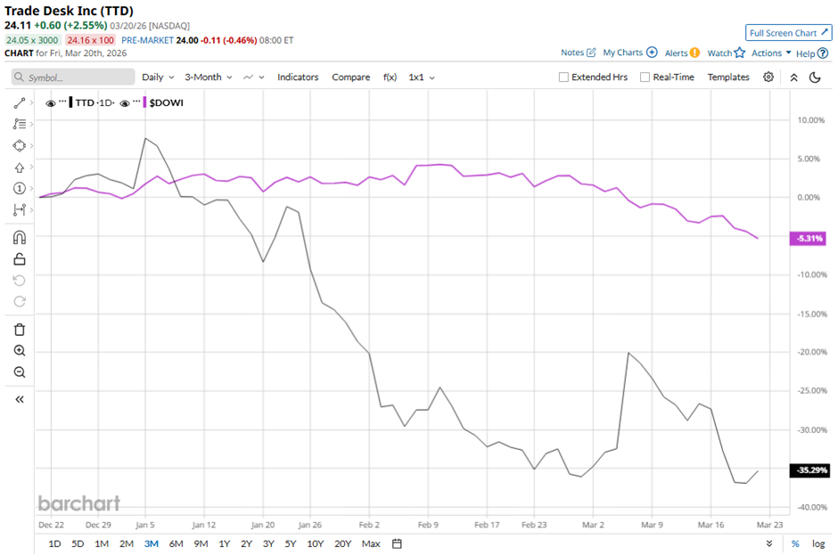 With a market cap of $11.7 billion, The Trade Desk, Inc. (TTD) is a technology company that operates in the United States and internationally, specializing in digital advertising solutions. It enables advertisers and agencies to create, manage, and optimize data-driven campaigns across multiple formats such as connected TV (CTV), video, display, audio, and native ads on various devices. Companies valued at $10 billion or more are generally labeled as “large-cap” stocks, and Trade Desk fits this criterion perfectly. Headquartered in Ventura, California, the company also provides data and value-added services to support effective advertising strategies. Micron Technology Hikes Its Dividend 30% Due to Surging FCF - MU Is Worth 34% More - What's the Best Play? As Trump Admin Warns on Airport Closures, Should You Sell Delta Airlines Stock? Iran War, Oil Volatility and Other Key Things to Watch This Week Tired of missing midday reversals? The FREE Barchart Brief newsletter keeps you in the know. Sign up now! Shares of Trade Desk have plunged 73.6% from its 52-week high of $91.45. The stock has decreased 35.3% over the past three months, underperforming the broader Dow Jones Industrials Average's ($DOWI) 5.3% drop over the same time frame. Longer term, shares of the adtech company have tumbled 56.8% over the past 52 weeks, lagging behind DOWI’s 8.6% return over the same time frame. Despite a few fluctuations, the stock has been trading below its 50-day and 200-day moving averages since last year. Trade Desk has underperformed due to intense competition from dominant digital ad platforms like Alphabet Inc. and Amazon, limiting its role as a primary advertising platform. Additionally, Trade Desk shares fell 4.8% following its Q4 2025 results on Feb. 25 due to a weaker-than-expected Q1 2026 outlook, with projected revenue of at least $678 million and adjusted EBITDA of about $195 million. Despite beating estimates with Q4 revenue of $847 million (up 14% year-over-year) and adjusted EPS of $0.59, investors were concerned about margin compression, as net income margin dropped to 22% from 25% year-over-year. In comparison, rival Omnicom Group Inc. (OMC) has shown less pronounced decline than TTD stock. OMC stock has fallen 7.1% on a YTD basis and nearly 7% over the past 52 weeks. Despite TTD’s weak performance, analysts remain moderately optimistic about its prospects. Among the 38 analysts covering the stock, there is a consensus rating of “Moderate Buy,” and the mean price target of $31.94 suggests a premium of 32.5% to current levels. On the date of publication, Sohini Mondal did not have (either directly or indirectly) positions in any of the securities mentioned in this article. All information and data in this article is solely for informational purposes. This article was originally published on Barchart.com