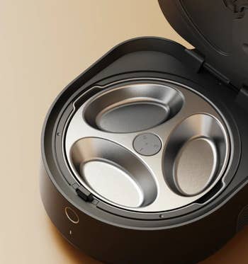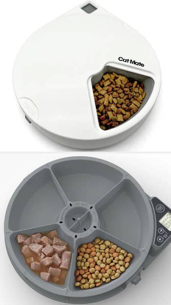 Many feeders are only designed to dispense dry food, but what if your cat also eats wet food throughout the day? This rotating feeder has five separate compartments that can hold up to 11.5 ounces of wet OR dry food. You can program up to four individual mealtimes, with one compartment already accessible. The easy-to-use digital timer allows you to schedule the feedings right on the device. It also comes with twin ice packs to keep wet or raw food fresh while it's stored in the feeder. Did I mention both the cover *and* feeding compartments are dishwasher safe?
