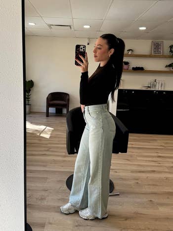 Promising review: "This is one of my favorite pair of jeans. I am usually a 32, and quite curvy, which causes waist gaps in most jeans. So I ordered the 32 and 33. They both fit quite well. I went with the 33 because it’s longer and more roomy around my hips, and gives me the baggy fit I wanted. The cinch waist allowed me to tighten the waist. It really is perfect, and I just ordered this in another color." —Peace