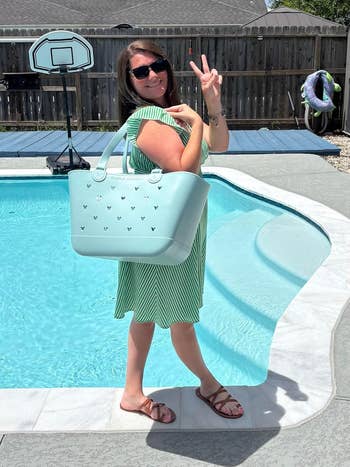 Promising review: "The best sports mom bag I’ve found! Not only is it cute, it’s completely functional as well. I love that it holds so much (the large is perfect for lots of stuff, but not overly huge. I can pack water bottles, snacks, sunscreen, books/kindle, umbrella, and everything in between! I also love that I can personalize it with charms and stuff — the Bogg bag charms fit. Also, the fold-down straps are great. They don’t get in the way at all. I’ll also note that it’s super easy to clean. Just empty it and spray it out with a hose. Even the white has stayed clean. Love love love! Get this bag! You won’t regret it!" —Amoora