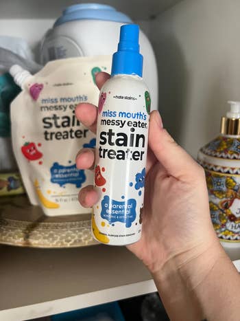 Promising review: "I recently tried Miss Mouth's stain remover spray, and I am impressed! This spray effortlessly removed tough stains on my clothes, leaving them spotless. This spray has removed oil stains from cooking, baby formula, breastmilk stains from newborn spit-ups, and many other stains — the list is long. We have yet to find a stain that this spray doesn't tackle. Its pleasant scent and quick action make it a must-have for anyone dealing with messy eaters or accidental spills." —Tiffany B.