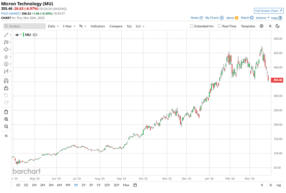 Memory stocks slipped on Wednesday, March 25, even as the broader technology sector held steady, and the pressure showed up in Micron Technology (MU). The stock fell 3.4% after Google introduced TurboQuant, a compression algorithm designed to reduce memory consumption in artificial intelligence (AI) systems. TurboQuant directly targets inefficiencies in the key-value cache, a critical component that stores frequently accessed data in AI workloads. The algorithm also demonstrated up to an 8x performance improvement over unquantized keys on NVIDIA Corporation (NVDA) H100 GPU accelerators, highlighting a meaningful leap in efficiency. Should You Buy the Dip in Western Digital Stock as Google Launches TurboQuant? Markets move fast. Keep up by reading our FREE midday Barchart Brief newsletter for exclusive charts, analysis, and headlines. Investors moved quickly to interpret the implications for Micron. If AI systems can deliver more output with less memory, the long-term demand trajectory for memory chips could moderate. The concern triggered a broader sell-off across memory stocks, with Micron at the center of the reaction given its direct exposure to AI-driven demand. Against this backdrop, let us discuss whether the decline points to emerging weakness in Micron’s story. Or does it present a window for long-term investors to step in while sentiment cools? Best known for its memory chips, Micron designs and manufactures dynamic random-access memory (DRAM), NAND flash memory, and storage solutions that sit at the heart of data centers, personal computers (PCs), smartphones, and automobiles. The company commands a market cap of approximately $400.9 billion and operates at the center of the AI infrastructure buildout, where high-performance memory has become indispensable. The stock has delivered a remarkable run. Shares of the Boise, Idaho-based company have skyrocketed 293.6% over the past 52 weeks and gained 128.2% in the last six months. Still, momentum rarely moves in a straight line. The stock fell 15.15% in just the last five trading days as a series of volatile developments weighed on investor sentiment. From a valuation standpoint, MU stock is currently trading at 6.89 times forward adjusted earnings. The figure is trading below both the industry average and its own five-year average multiple. The gap signals a discount and hints at a more measured entry point. On the income front, Micron currently pays an annual dividend of $0.60 per share, which translates to a dividend yield of 0.16%. On March 18, the company raised its quarterly dividend by 30% to $0.15 per share, payable on April 15, to shareholders on record as of March 30. Micron delivered a standout fiscal 2026 Q2 performance on March 18. Revenue rose 196.3% year-over-year (YOY) to $23.9 billion, beating the $19.9 billion Street forecast. The growth came from record performance across DRAM, NAND, and high-bandwidth memory, all supported by strong AI demand and firmer pricing. The company translated that demand into profitability. Non-GAAP operating income grew 719.9% from the year-ago value to $16.5 billion, while non-GAAP net income rose 686.4% from the previous year’s quarter to $14 billion. Non-GAAP EPS climbed 682.1% YOY to $12.20, surpassing analyst estimates of $8.80. Adjusted free cash flow totaled $6.9 billion, showing that earnings strength flowed directly into cash generation. Micron closed the quarter with $16.7 billion in cash, marketable investments, and restricted cash, giving it flexibility to fund expansion. Management plans to increase spending to meet persistent demand, with construction-related costs expected to exceed $10 billion this year. Additionally, the company is building capacity in the U.S., including fabrication plants in Idaho and New York. Its $100 billion New York campus remains on track for operations in the second half of 2028. In terms of guidance, Micron’s management projects Q3 fiscal 2026 non-GAAP revenue of about $33.5 billion, with a possible variation of $750 million on either side. Non-GAAP EPS is projected at roughly $19.15, with a potential swing of $0.40. Analysts largely track the outlook. They forecast Q3 fiscal 2026 EPS of $18.97, reflecting a 996.5% YOY increase. For the full fiscal year 2026, estimates call for 651% growth to $57.70, followed by another 67% rise to $96.55 in fiscal year 2027. Wall Street continues to show conviction in Micron, and recent analyst moves underline that stance. Bank of America raised its price target to $500 from $400 after the latest quarterly results, signaling stronger confidence in the company’s trajectory. Mizuho Financial Group also lifted its price target from $480 to $530, pointing to robust profitability and a clear roadmap across DRAM and NAND. The firm kept an “Outperform” rating on the shares. Meanwhile, JPMorgan Chase took an even more optimistic view, increasing its target from $350 to $550 while maintaining an “Overweight” rating. Currently, Wall Street has assigned MU stock an overall rating of “Strong Buy.” Among 41 analysts covering the stock, 31 rate it a “Strong Buy,” six have issued a “Moderate Buy,” while four recommend “Hold.” To that end, the average price target of $489.29 implies potential upside of 36.7%. Meanwhile, the Street-high target of $750 points to a possible gain of 109.6% from current levels. On the date of publication, Aanchal Sugandh did not have (either directly or indirectly) positions in any of the securities mentioned in this article. All information and data in this article is solely for informational purposes. This article was originally published on Barchart.com