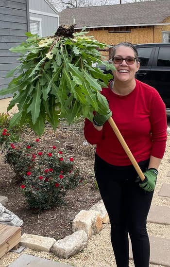 The reviewer who shared their before and after pics above said they have an autoimmune disease that makes pulling overgrown weeds tough — but with this handy tool, they were able to clear the 6-foot weeds from their garden bed!