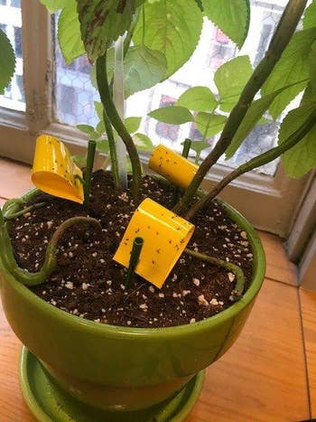Promising review: "Holy cow these suckers work! I'm so grossed out by the result, but at the same time, I have a sick sense of satisfaction. I used these in my houseplants that are breeding fungus gnats. I used them in conjunction with beneficial nematodes, and they definitely cut down on the number of gnats in our house. Unfortunately, I added a new houseplant, plus repotted one that had outgrown its prior home, and we are wrapped up in them again. I'm buying another package of sticky traps as soon as I finish this review!" —Megan