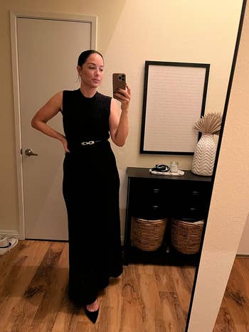 I recently rented this dress from Nuuly and am strongly considering buying it in a color I really love. It's wonderfully stretchy and comfortable. I went with my true size, though I could've sized down since the material offers decent stretch. (I have a small chest, so YMMV.) Ultimately, I think I prefer having that extra bit of movement and freedom, but if you really want the dress to cinch your waist, then you could opt for a size down. IMO, this dress is great for the office — it's a thicker material that is pretty wrinkle-resistant, so it doesn't look like a crinkled-up napkin when I stand up after a few hours typing away at my desk. It's also totally something I'd wear outside of the office casually with sneakers or for a dressier occasion with sandals or heels, so yes, it's expensive, but you can really get your money's worth.