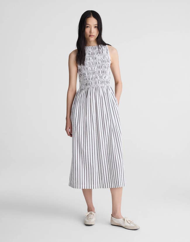 Promising review: "I love the shape of this dress! When I saw it in the store, I figured it would look good on, but I was pleasantly surprised when I tried it on!! The weight of the fabric is perfect to give the dress a swingy feel, and the elastic at the back of the waist really gives the dress shape. Lastly, I really appreciate how large the pockets are, while still being essentially invisible in the silhouette. Well done! I’m usually between sizes small and medium, and the small was a perfect fit for me." —Jasmine