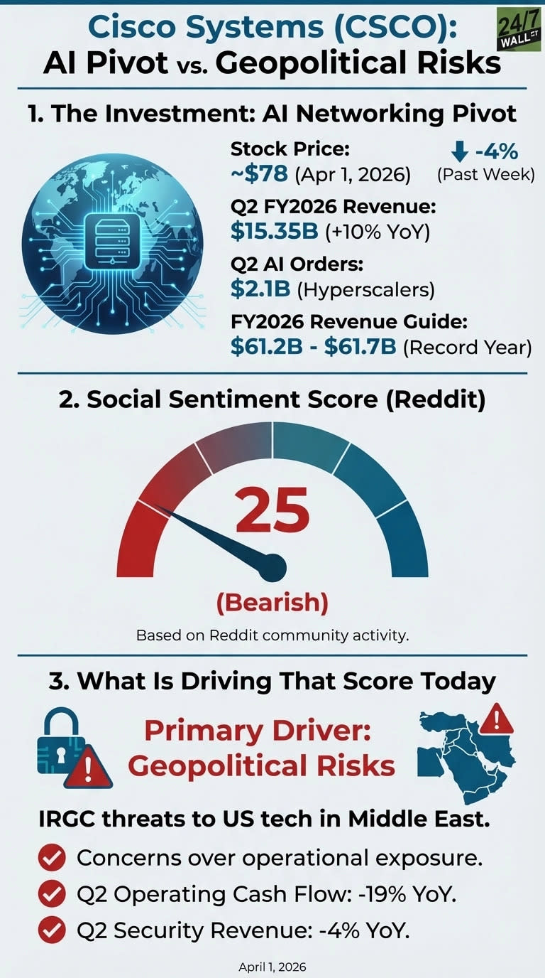 Cisco (CSCO) posted Q2 revenue of $15.35B, up 10% year over year, with $2.1B in AI infrastructure orders from hyperscalers and full-year guidance of $61.2B to $61.7B, the company’s strongest year on record. Operating cash flow declined 19% to $1.822B in Q2, and security segment revenue fell 4%, while the networking segment surged 21% to $8.29B. Arista Networks (ANET) is down 6% year to date versus Cisco’s 1% gain. Reddit sentiment on Cisco remains bearish at a score of 25 out of 100 due to geopolitical threats against US tech companies in the Middle East and concerns about Cisco’s physical infrastructure exposure in the region, despite Wall Street’s 17 buy ratings and $88.8 price target. A recent study identified one single habit that doubled Americans’ retirement savings and moved retirement from dream, to reality. Read more here. Cisco Systems (NASDAQ:CSCO) shares are trading around $77, down 4.7% over the past week, even as the business story looks stronger than it has in years. Cisco posted $15.35 billion in Q2 FY2026 revenue, up 10% year over year, and management guided for full-year revenue of $61.2 billion to $61.7 billion, which would be the firm's strongest revenue year on record. The headline catalyst: $2.1 billion in AI infrastructure orders from hyperscalers in a single quarter, up from $1.3 billion the prior quarter, with AI orders from hyperscalers expected to exceed $5 billion for the fiscal year. The Reddit sentiment score for Cisco sits at 25 out of 100, categorized as bearish. Peak community activity was on March 31 at noon ET, with an activity score of 66, 1,494 upvotes, and 418 comments across r/wallstreetbets, r/stocks, and r/investing. The dominant thread across subreddits centers on IRGC threats against US tech companies operating in the Middle East, with Cisco named directly alongside larger consumer-facing names. IRGC threatens strikes on US tech giants across the Middle Eastby u/[OP] in r/wallstreetbets Read: Data Shows One Habit Doubles American’s Savings And Boosts Retirement Most Americans drastically underestimate how much they need to retire and overestimate how prepared they are. But data shows that people with one habit have more than double the savings of those who don’t. The post generated 1,955 upvotes and 323 comments on r/wallstreetbets, 658 upvotes and 165 comments on r/stocks, and 389 upvotes and 176 comments on r/investing. Three concrete concerns drive the bearish tone: This infographic details Cisco Systems' AI networking pivot, revealing a bearish Reddit social sentiment score of 25 driven primarily by geopolitical risks and declining Q2 financial metrics. Cisco has physical infrastructure and enterprise customer exposure across the Middle East, making geopolitical escalation a direct operational risk. Operating cash flow declined 19% year over year to $1.822 billion in Q2, limiting the financial cushion if supply chains or regional contracts are disrupted. Security segment revenue fell 4% year over year, an awkward position for a company marketing itself as a trusted AI-era infrastructure provider. The company's critical networking segment revenue grew 21% year over year to $8.29 billion in Q2, and product orders rose 18% overall. CEO Chuck Robbins stated: "With over 40 years of customer trust, global scale, and a relentless focus on innovation, we believe Cisco is uniquely positioned to deliver the trusted infrastructure needed to securely and confidently power the AI-era." Cisco has also expanded its strategic footprint, including a collaboration with NVIDIA through its Secure AI Factory framework and a Memorandum of Understanding with Atom Computing to explore quantum networking. One risk the fundamentals cannot easily dismiss: heavy reliance on a small group of hyperscale AI customers, where spending patterns can shift quickly. Peer Arista Networks (NYSE:ANET) is down 6% year to date, underperforming Cisco's 1% gain over the same period. Analyst consensus sits at a target of $88.8 with 17 buy ratings and no sell ratings, suggesting Wall Street views the geopolitical noise as temporary. Q3 FY2026 earnings will show whether the AI order trajectory continues toward the $5 billion annual target or reflects hyperscaler pullback. Most Americans drastically underestimate how much they need to retire and overestimate how prepared they are. But data shows that people with one habit have more than double the savings of those who don’t. And no, it’s got nothing to do with increasing your income, savings, clipping coupons, or even cutting back on your lifestyle. It’s much more straightforward (and powerful) than any of that. Frankly, it’s shocking more people don’t adopt the habit given how easy it is.