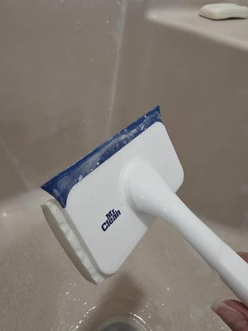 Promising review: "Wow! What a time saver. Once the Magic Eraser is wet and you scrub a couple of times on the shower wall, you can feel it start to glide once it cuts through the shower grime. My shower glass window is super clean, which is difficult for other products to do. I am excited to have a clean shower with minimal effort and in an all-in-one product. This will definitely be a shower and tub staple for my household!" —Kris
