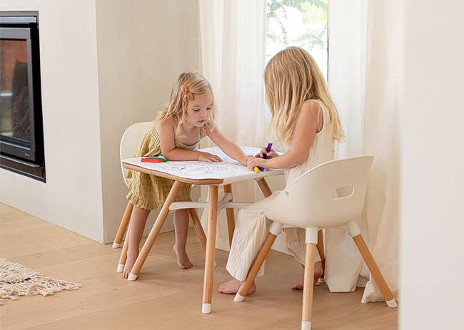 I have owned this table and chairs for two years and it's held up to all kinds of toddler wear-and-tear. My youngest is very into coloring and is constantly drawing *all* over them with markers and Crayons (despite my best efforts), but it wipes clean in seconds with a Magic Eraser. I've used it to set up fun holiday activities, to stage visits from our Elf on the Shelf, and, of course, to give them snacks that I really do not want eaten on my couch. I love that it's aesthetically pleasing and will work with the decor of any room if we move it around the house. Additionally, the edges of the table are rounded and have protected my kids from getting *too* hurt when they inevitably crawled. I'm a big fan! Also, Lalo is a small business!