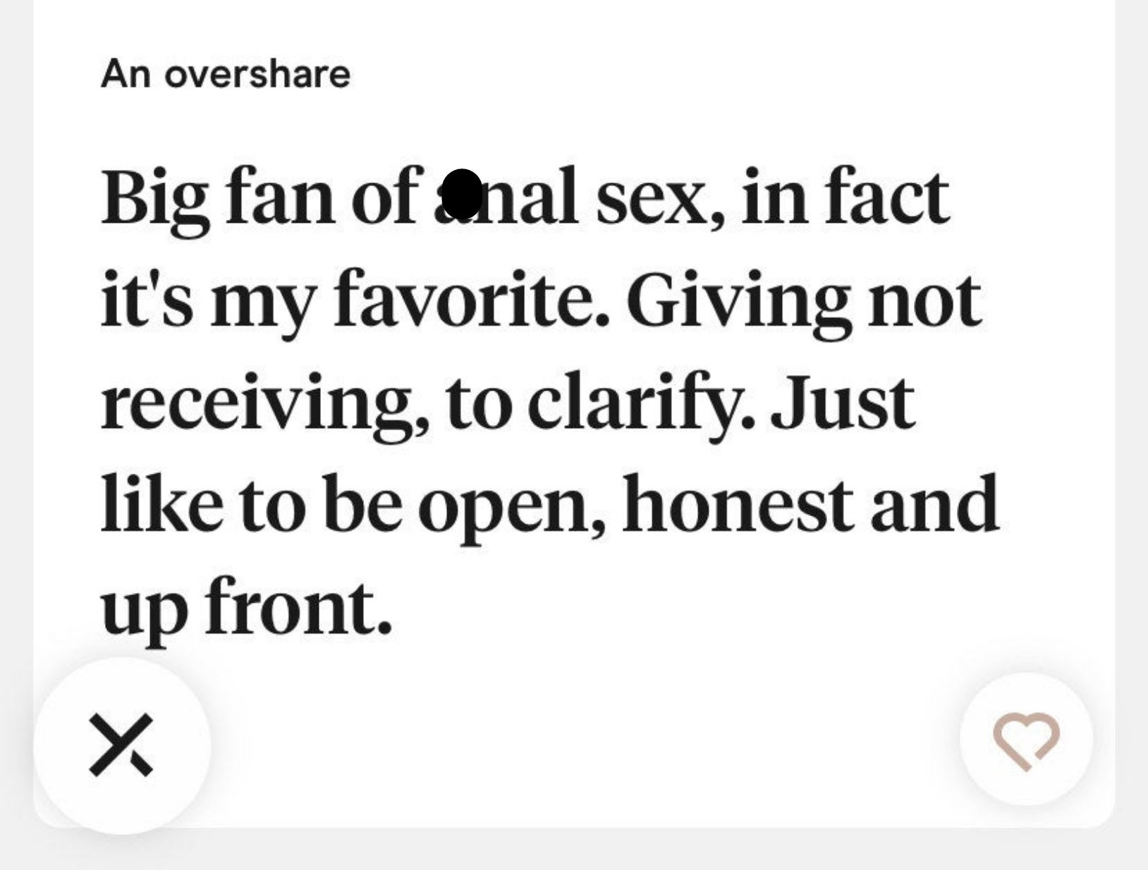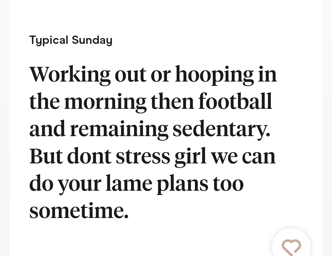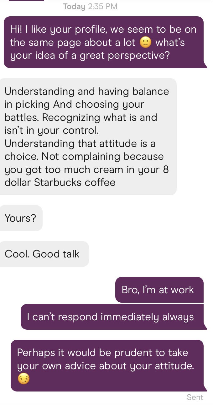 I'm a New York City-based Staff Writer who enjoys covering lifestyle, relationships, and women's content. Context: "We matched on an app and then moved on to WhatsApp. The first message asking to meet was on a Sunday, the next on Monday, and then the final one FIVE WEEKS later. It made me SO ANGRY."ย Yes, chances are, you could have texted him back in the ~24-hour period. Even busy people check their phones. But, I don't fault you for not! I forget about messages/notifications all the time, especially when I'm busy! I'll respond in my head and think I actually sent a message. Or, I'll tell myself I'll respond later when I have more time to think. Sometimes it slips my mind!ย All of that "rationalizing" aside, you were under no obligation to respond right away, and he didn't have to be so RUDE! I'm not sure if he thought he was going to guilt you into begging for a second chance, but clearly that didn't work. His response is deterring. Why would you want to meet him now? I had a man on Hinge once get SO sassy with me (and send multiple attacking messages) when I didn't answer him for about 12 hours (three messages into our entire conversation), and it happened to be the day my dog died. So, yeah, I wasn't on Hinge a lot. It's scary how fast men can switch up, but it's better you saw those true colors before meeting him. Finally, NONE of this matters at all because he clearly doesn't stick to his own "principles" since he hit you up five weeks later to see if you'd want to grab drinks. You dodged a bullet. Context: "Can you explain this? Background info: The voice prompt is based on the meme where you say, 'I'm a 10, but...' and then fill in the blank with an annoying, embarrassing, or otherwise slight negative characteristic. This is the message he sent when he 'liked' my profile." Context: "His profile says he's 6'2, so yes he's tall, but he's not exactly going to 'tower' over me at 5'7. But, he seemed really into feeling tall and making sure I knew it." Context: "Gotta love a man pushing 40 who doesn't know what he's looking for yet, but is quick to complain about 'crazy' women." Context: "It starts with the 'wyd hotyy,' and I know it seems to end, but I eventually responded with something simple. I donโt know why I decided to respond, but itโs not like he offended me in any way, so I gave him another chance to see if the language changed. Note to self: Not everyone deserves second chances. The responses were just too ridiculous for me and I can be a bit sarcastic, so I replied. The fact that HE REPLIED and continued with the same 'snack' comment again had me a bit baffled. Clearly his flirting game is just too strong for me, lol. The last one was just like...why?" I'm also just wondering if this means he kisses on every first date, regardless of chemistry. Not all first dates are a good fit. Does he try to instigate a kiss, even if the vibes are off? Is it, like, his "thing" to make sure he kisses every person he takes out? I'm just curious about how this works! But bleegghhh, I hate this as a dating profile prompt. Context: "The way this profile devolved was too much for me, LMFAO. Also, the photos were definitely fake. It's giving catfish."ย Context: "At least two of his photos noticeably used a filter."ย Context: "Things men put on their dating profiles ๐." I don't think women swiping on dating apps are overcome with relief when they read that Brad from Hoboken thinks "good sex" is the hallmark of a good relationship. Like okay...what else ya got?ย Context: "Profile didn't say anything about ethical non-monogamy or an open relationship. So, I don't know if she knows he's on the apps or not."ย Context: "When you exist with big boobs."