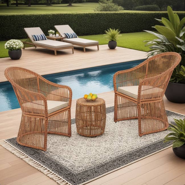 We hope you love our recommendations! While every product is independently chosen by our editors, BuzzFeed and our publishing partners may collect a share of sales or other compensation from the links on this page. You can read more about how our affiliate partnerships work in our Editorial Standards & Ethics Guide. It's officially time to stop treating your backyard like a neglected storage unit and start transforming it into a 5-star resort. Promising review: “Very nice sturdy lounges with thick cushion that keeps its shape after seating. My husband put it together without my help. We got 2 of these and they look very nice next to each other. Love the trays underneath as they come so in handy, eliminating the need for other little tables. We have them under patio shade and we live in California, not sure how they would do in full sun. We have them covered in nice pocket beach towels though! We would definitely recommend these lounges!” —Sandina Price: $323.20+ (originally $361.74+; available in 14 colors) Promising review: “I’ve put together quite a few pools and this is the easiest one so far. Everything snaps together well and disassembles easily. Struggled with draining at the end of the season but that was likely user error, lost the instructions. Survived the summer with my kids, no issues.” —Erica Price: $228+ (originally $299+; available in two sizes and also in styles with floats and games) Make sure you grab a screen for your backyard while you're at it! Promising review: "I absolutely love it. TV who? 😂 The sound, the quality, the picture all of it is perfect. Highly recommend. About to buy all my family members one, plus it already had Netflix and YouTube so all you really need is Wi-Fi/Hotspot and you good." —Rosa Price: $43.99+ (originally $49.99+; available in two colors and styles) Promising review: “We bought these lights for an outdoor patio wall. They are perfect. The size is medium, large enough to give light but not overpowering. They were simple to hang and the look is just great. The price was right too.” —Sharon Promising review: "Overall, I really enjoy having this trampoline The trampoline was shipped quickly. Directions were easy to follow. Trampoline is made very well. The mat is firm and bouncy. Great for families and came with an easy to follow instruction manual. The enclosure as well made and secure. Overall, highly recommend." —Aleeit Promising review: "I love that the bowl of this firepit is not bolted to the frame and can be independently lifted out. It makes it so much easier to take care of. The assembly was extremely easy. The lid is sturdy and also easy to handle with the included hook. My absolute favorite thing about this firepit was that it came with a cover included. This firepit is sent to you ready to be taken care of well and easily. The cover seems to be water-resistant and has an elastic band at the base and is simple to put in place. The size is perfect and easy to handle. It is lightweight whether the bowl is in the frame or you are carrying each piece separately. If you have been looking for a great and easy-to-care-for firepit, you found it." —anonymous Promising review: “Best product. Kids are in heaven, and grandma as well. My daughter bought this for her grandbabies. Boy, it keeps all six busy.” —Robyn And get a similar adult-size chair here! Promising review: “Absolutely adorable!!! So easy to put together and cute as can be. What a perfect kid’s chair for the money!!!! Kids and animals all love it. Walmart is truly stepping up their design game.” —Holly Promising review: “So impressed with the quality! I think we are going to get another one!” —jill Price: $405.99+ (available in five colors) Promising review: “We lined about 12 of these up for a backyard party and they totally transformed our backyard. A very inexpensive touch for a loud statement. We had some before and they lasted a couple of years! Highly recommend!” —paige Promising review: “My new 15-foot umbrella has made my outdoor living space complete! The solar lights make evening entertaining special. It completely covers my outdoor furniture and offers not only good shade but also protects my patio furniture from the rain. This was a great purchase!” —Sandra Price: $159.99+ (originally $214.99; available in 12 colors) Price: $359.99+ (available in four colors) Price: $103.78+ (available in five colors) Promising review: “These chairs were a smoking hot deal so of course we had to get four for our firepit area. They were extremely easy to put together. The required hardware was very organized and the tools required were included. We love that they fold up for easy storage. Highly recommend these chairs.” —DLayne Price: $79.99+ (originally $239.99; available in 14 colors in a single or pack of two) Promising review: “Really love this fountain. Not too big and not too small. It looks more expensive than what it costs. The setup and assembly took 10 minutes. The sound from it is just wonderful. I recommend this fountain and so glad I bought it.” —GianC Promising review: “Better Homes and Gardens planters are quickly becoming my favorite. And this extra tall one is no exception. I love the textured design on the outside. It has very sturdy walls and should hold up for the long term. I was pleased with the first one I bought, so I bought a second for the back deck. I'm excited to have one of this height to use as a statement piece with other average-sized pots in both locations. They have a rubber plug in the drain hole, so it can be used either way.” —Walmart customer Promising review: “Great value for the money, recommend!” —Kathy Promising review: “This has become my favorite piece of outdoor furniture. The canopy can be adjusted to ensure I'm always protected from the sun. It's comfortable and sturdy enough for my elderly mother to sit on it and get up from it without assistance. I mig
