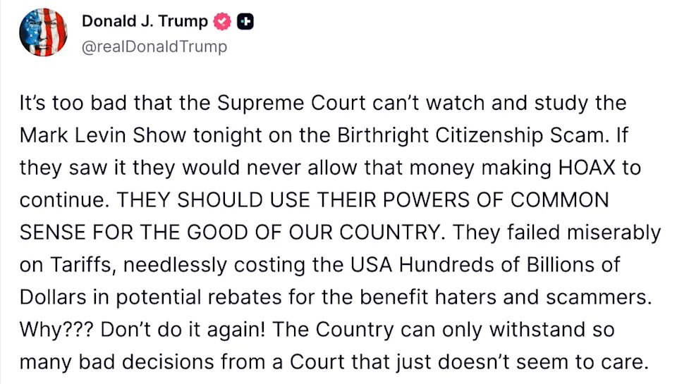 President Donald Trump went on an unhinged 1 a.m. rant about the Supreme Court as it considers whether to allow him to scrap birthright citizenship. The 79-year-old president suggested on Truth Social that it’s “too bad” the Supreme Court didn’t “study” Mark Levin’s Fox News show, in which the host argued that the 14th Amendment was not intended to grant birthright citizenship to children of undocumented immigrants. “If they saw it they would never allow that money making HOAX to continue. THEY SHOULD USE THEIR POWERS OF COMMON SENSE FOR THE GOOD OF OUR COUNTRY,” Trump wrote. “They failed miserably on Tariffs, needlessly costing the USA Hundreds of Billions of Dollars in potential rebates for the benefit haters and scammers. Why??? Don’t do it again! The Country can only withstand so many bad decisions from a Court that just doesn’t seem to care.” The nation’s highest court heard oral arguments last week on whether the U.S. should stop granting citizenship to children of undocumented immigrants, as proposed in an executive order signed by Trump. The move has been struck down by every lower federal court that has considered the challenge. The conservative Supreme Court, including justices nominated by Trump, also appears highly skeptical about whether the president can remove the citizenship clause. Trump took the unusual step of sitting in on the April 1 hearing to watch the justices debate his push to end automatic birthright citizenship. The president stormed out of the hearing after the SCOTUS justices shot down several arguments from the administration’s attorney, Solicitor General D. John Sauer. One of the sharpest exchanges came from Chief Justice John Roberts, who pushed back after Sauer suggested the framers of the 14th Amendment could not have foreseen how “we’re in a new world now,” with billions of people “one plane ride away from having a child who’s a U.S. citizen.” “It’s a new world. It’s the same Constitution,” Roberts replied. Elsewhere, Trump appointee Justice Neil Gorsuch pressed Sauer on whether children born to Native Americans in the U.S. should be considered birthright citizens. “Ah, I think… so,” Sauer said. “I mean, obviously they’ve been granted citizenship by statute,” he added, referring to the Indian Citizenship Act of 1924. Gorsuch noted that before the law was passed, children born to tribal Native Americans were not automatically considered birthright citizens. During the Sunday episode of Life, Liberty and Levin, the pro-Trump Fox News host Mark Levin argued that the 14th Amendment was never intended to grant U.S. citizenship beyond freed Black slaves and their children. “You on the court, you get to decide now on a big issue, you should leave it to the people in our elected representatives or the amendment process with a legislative process,” Levin said. “But if you rule on this and constitutionalize this, you will be known as the most activist court in the history of the Supreme Court, and the damage is incalculable.” Section 1 of the 14th Amendment states, “All persons born or naturalized in the United States, and subject to the jurisdiction thereof, are citizens of the United States and of the State wherein they reside.” Levin, 68, has a law degree from Temple University, worked in the legal department of Texas Instruments, and has never argued a case in front of the Supreme Court. His road to a slot on Sunday nights on Fox News started as a serial guest on Rush Limbaugh’s radio show, then his own slot on conservative radio networks.